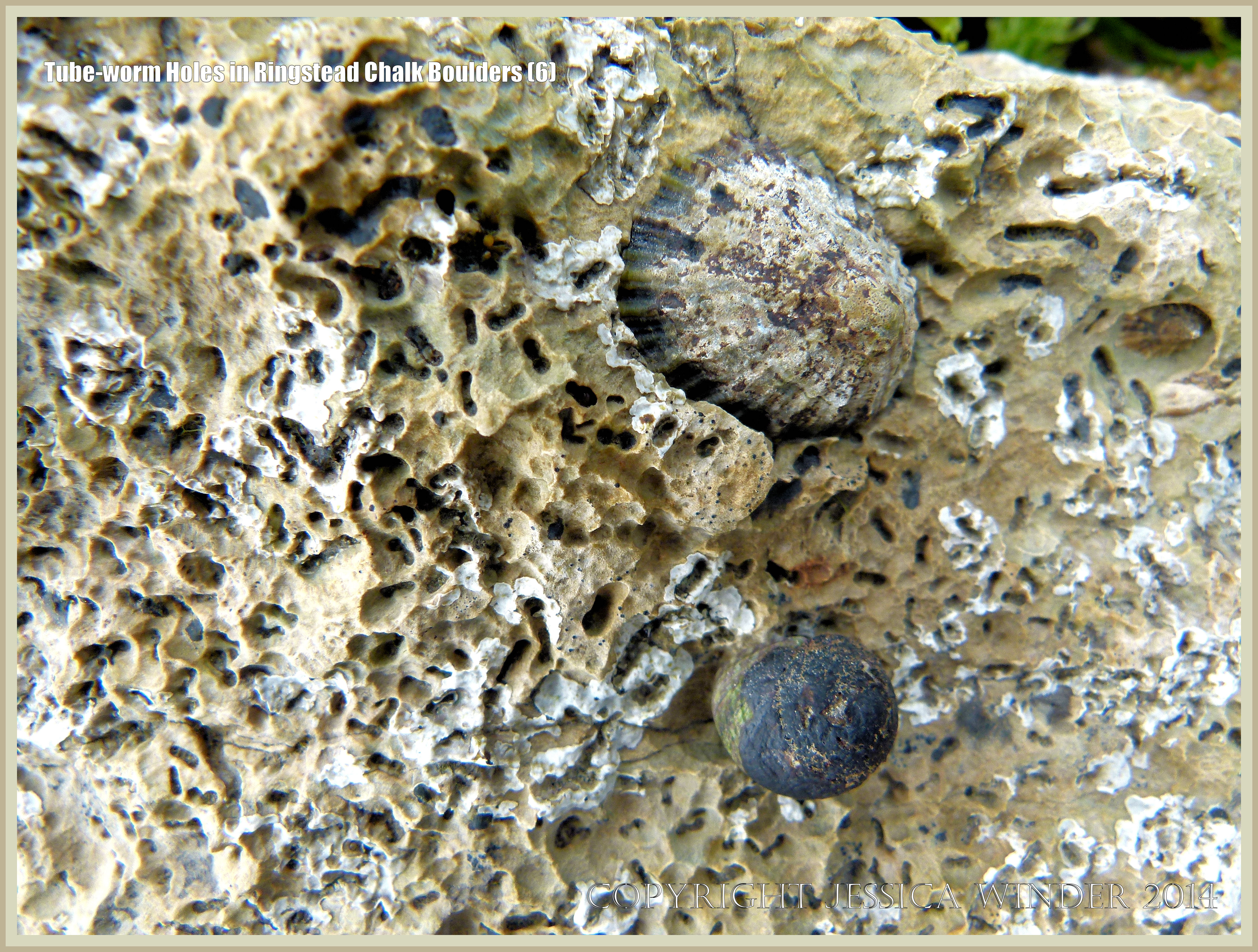 Tube-Worm Holes in Ringstead Chalk Boulders 6 – Detail of tube-worm burrows in a chalk beach boulder with attached limpet and common periwinkle. The burrows are mostly unoccupied by the worms and mostly lack the mucus and sand-grain tube linings. Holes most probably made by Spionid polychaete worms of the Polydora genus. Photographed at Ringstead Bay in Dorset, England.