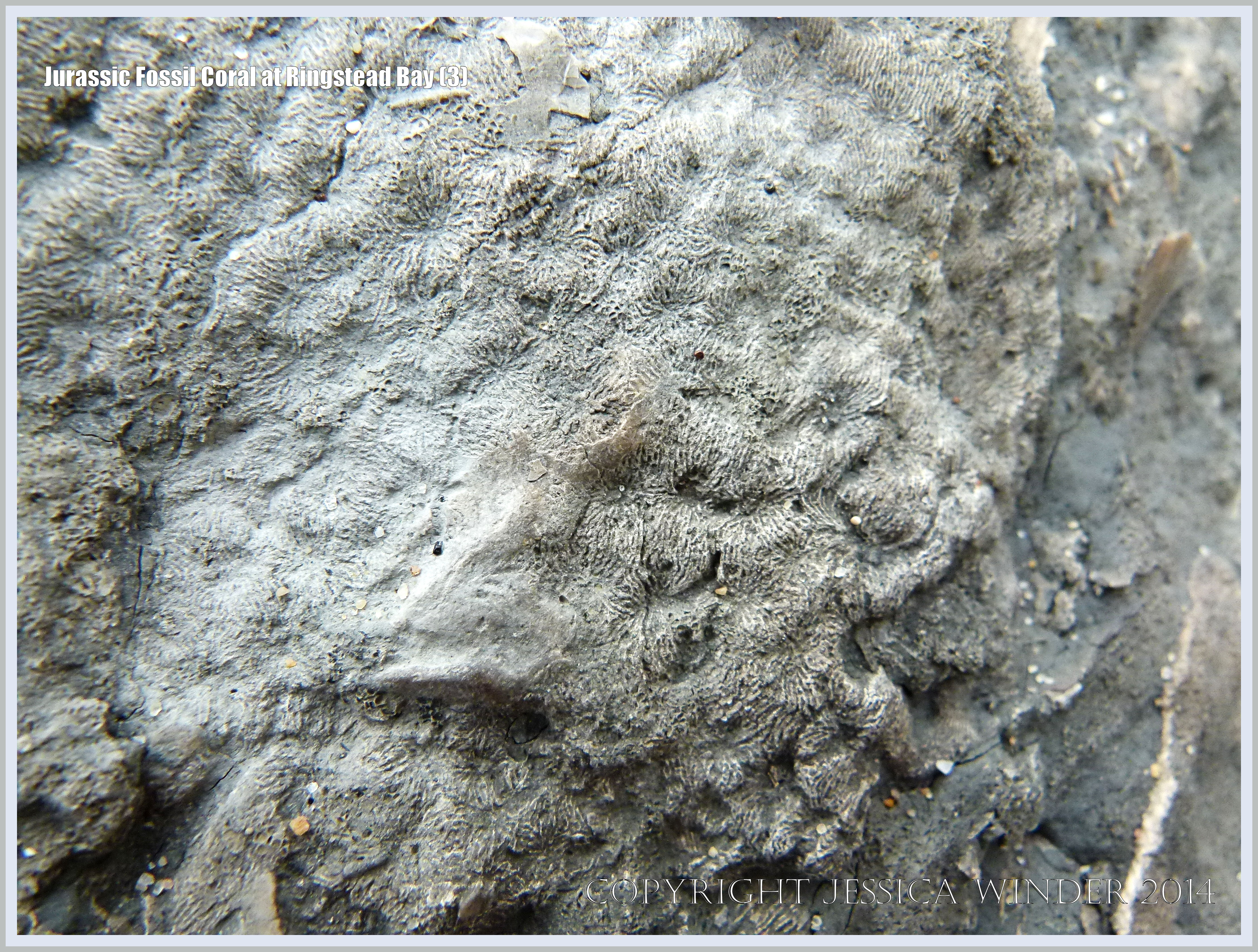 Ringstead Fossil Coral 3 – Fossil coral in the Ringstead Coral Bed of the Jurassic Corallian Formation at Ringstead Bay in Dorset, England. Thought to be a species of Thamnasteria; probably T. concinna or T. arachnoides.