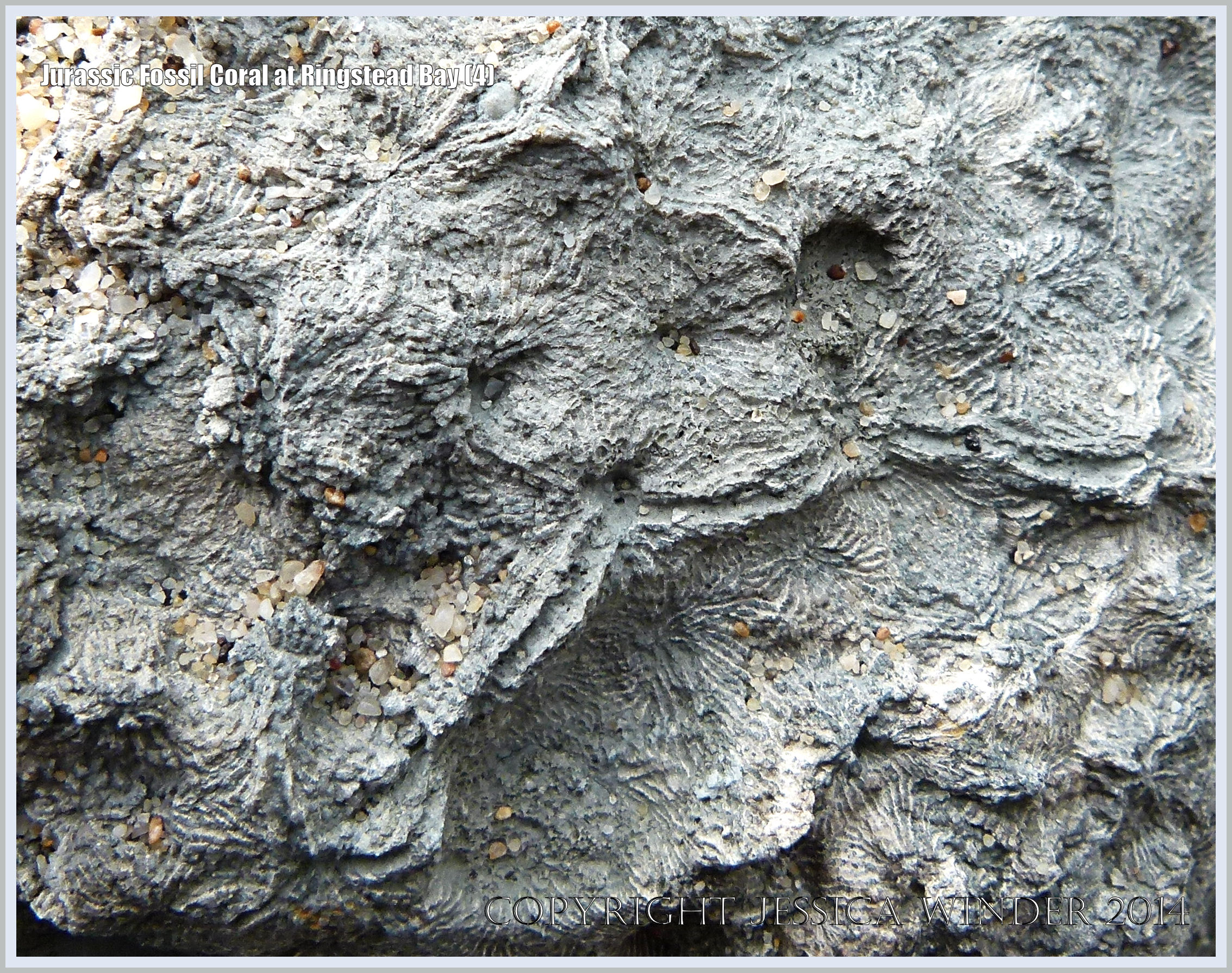 Ringstead Fossil Coral 4 – Fossil coral in the Ringstead Coral Bed of the Jurassic Corallian Formation at Ringstead Bay in Dorset, England. Thought to be a species of Thamnasteria; probably T. concinna or T. arachnoides.