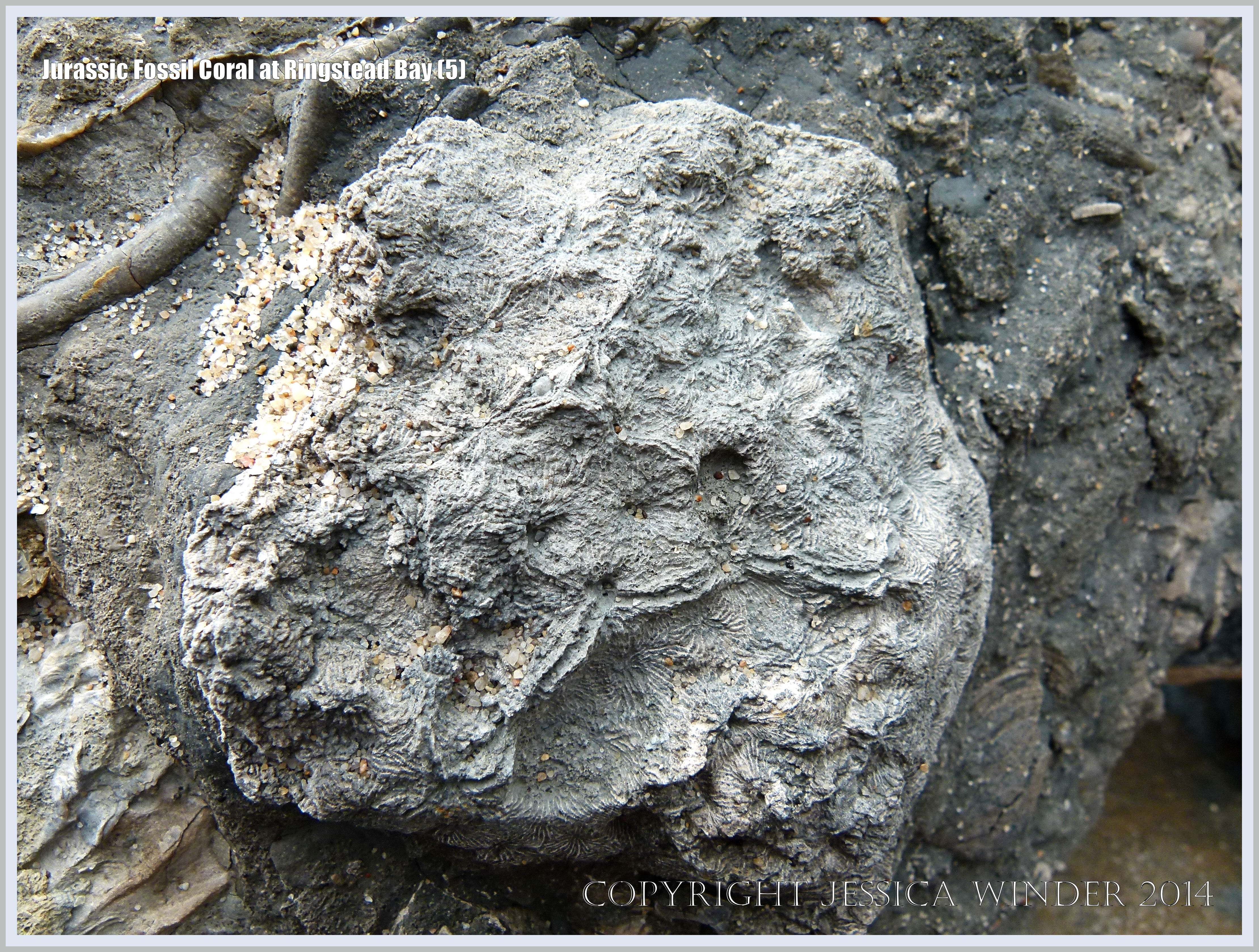 Ringstead Fossil Coral 5 – Fossil coral in the Ringstead Coral Bed of the Jurassic Corallian Formation at Ringstead Bay in Dorset, England. Thought to be a species of Thamnasteria; probably T. concinna or T. arachnoides.