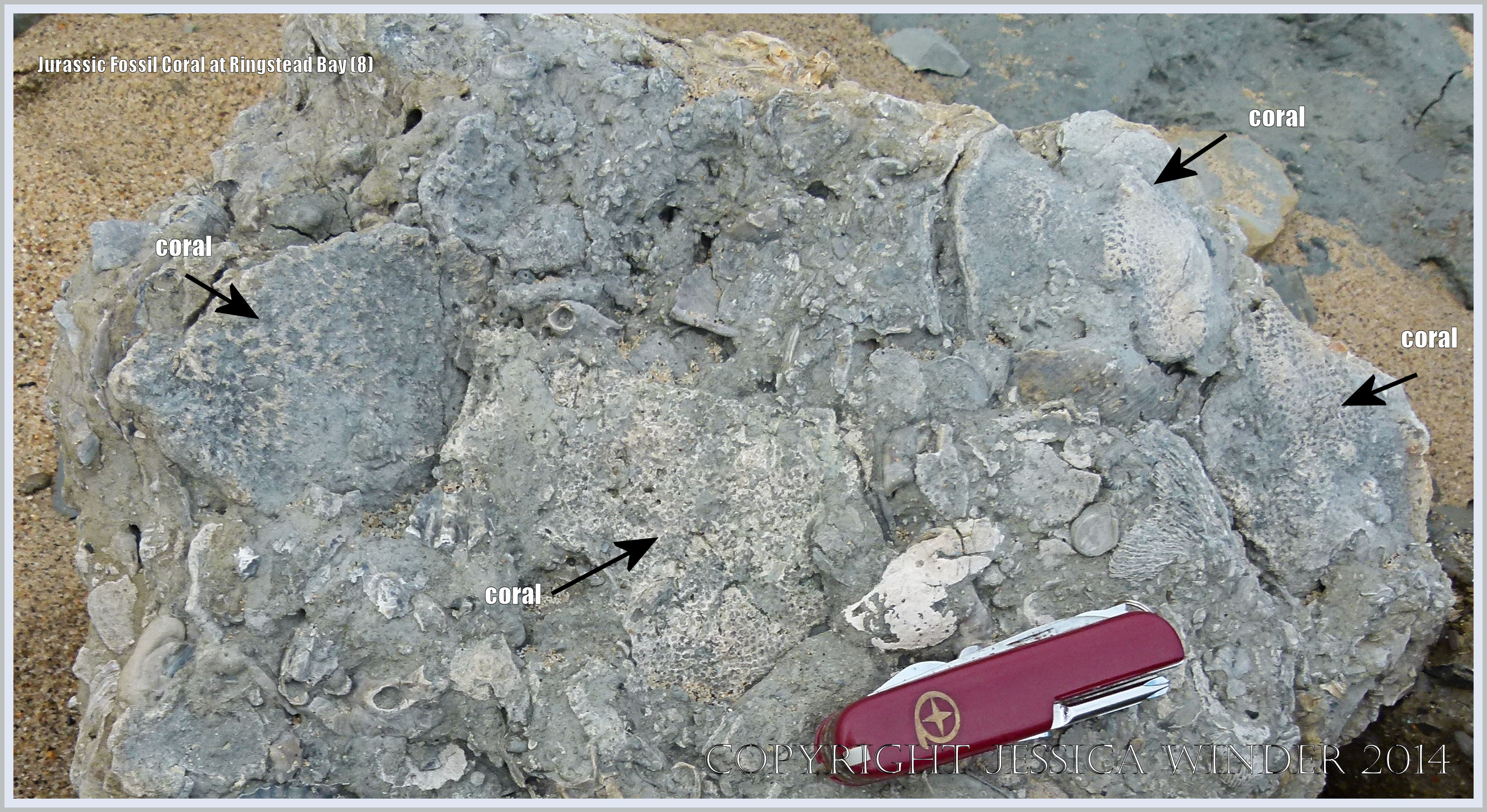 Ringstead Fossil Coral 8 – Fossil coral in the Ringstead Coral Bed of the Jurassic Corallian Formation at Ringstead Bay in Dorset, England. Thought to be fragments of either Thamnasteria concinna or Thamnasteria arachnoides. Pieces of coral amongst other shelly debris indicated by arrows.