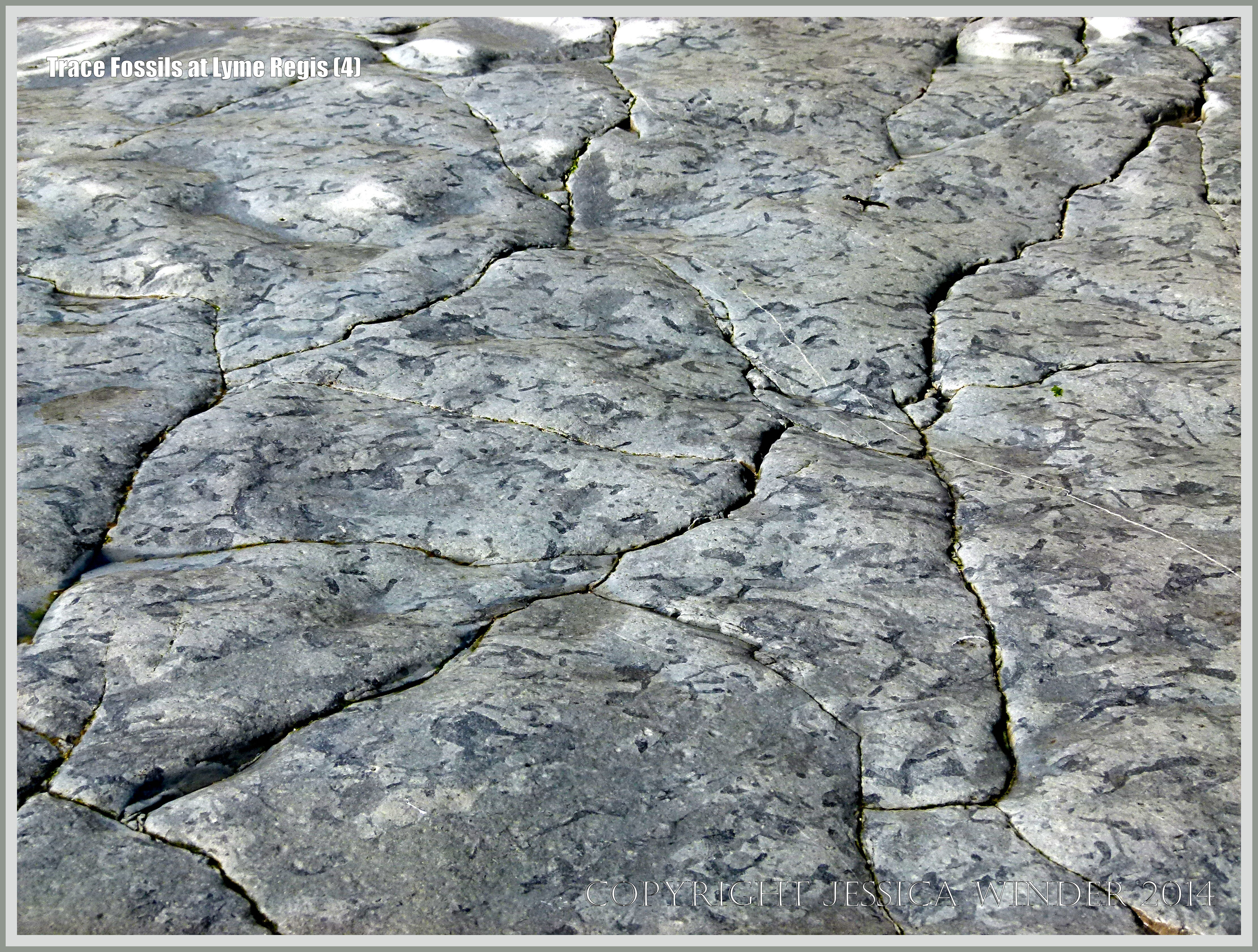 Trace Fossil Patterns At Lyme Regis 4 – Jurassic Blue Lias Limestone rock pavement with patterns made by trace fossils of burrows left by marine invertebrates like crabs and worms. Photographed on the seashore at Monmouth Beach in Lyme Regis, Dorset, England.