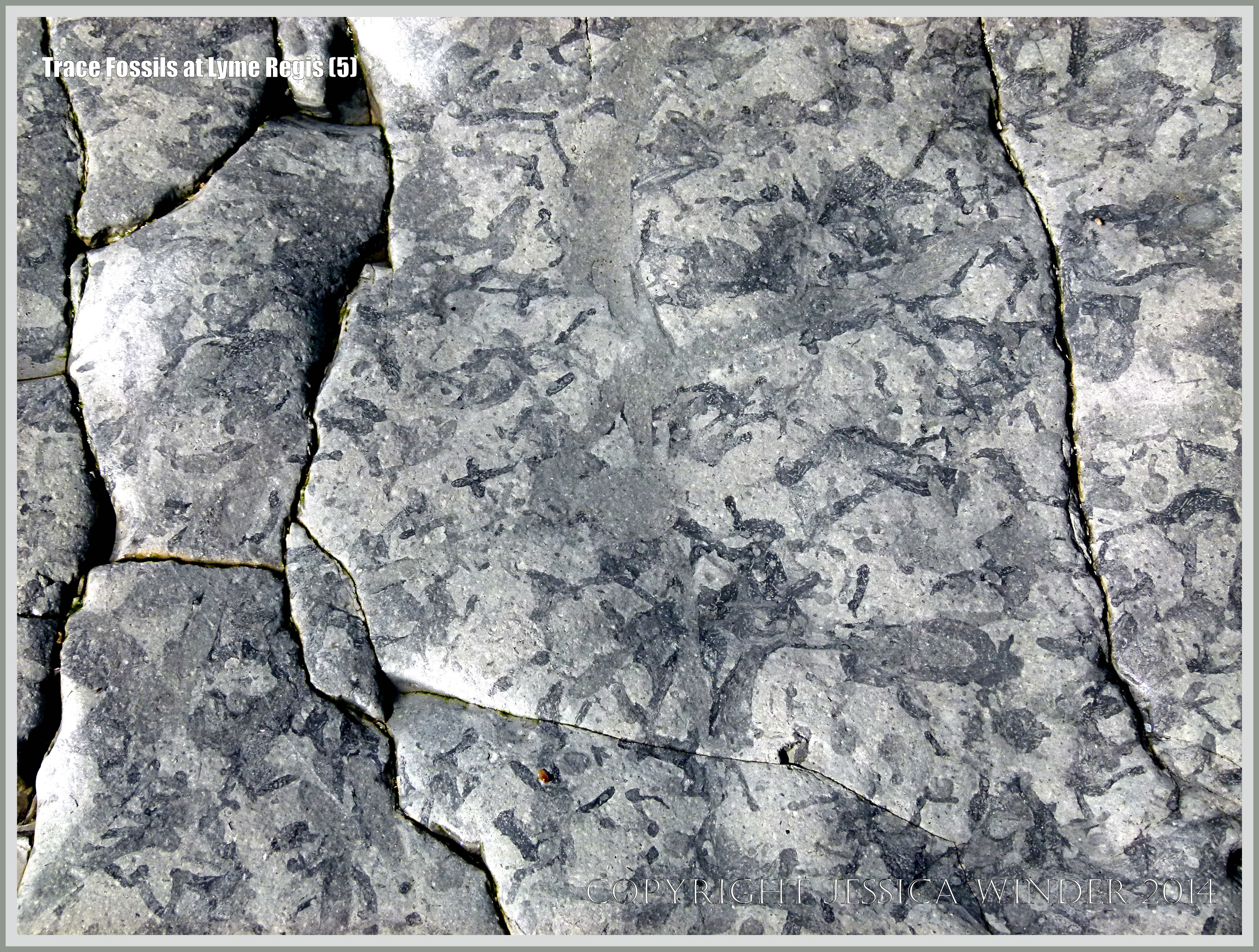 Trace Fossil Patterns At Lyme Regis – Jurassic Blue Lias Limestone rock pavement with patterns made by trace fossils of burrows left by marine invertebrates like crabs and worms. Photographed on the seashore at Monmouth Beach in Lyme Regis, Dorset, England.