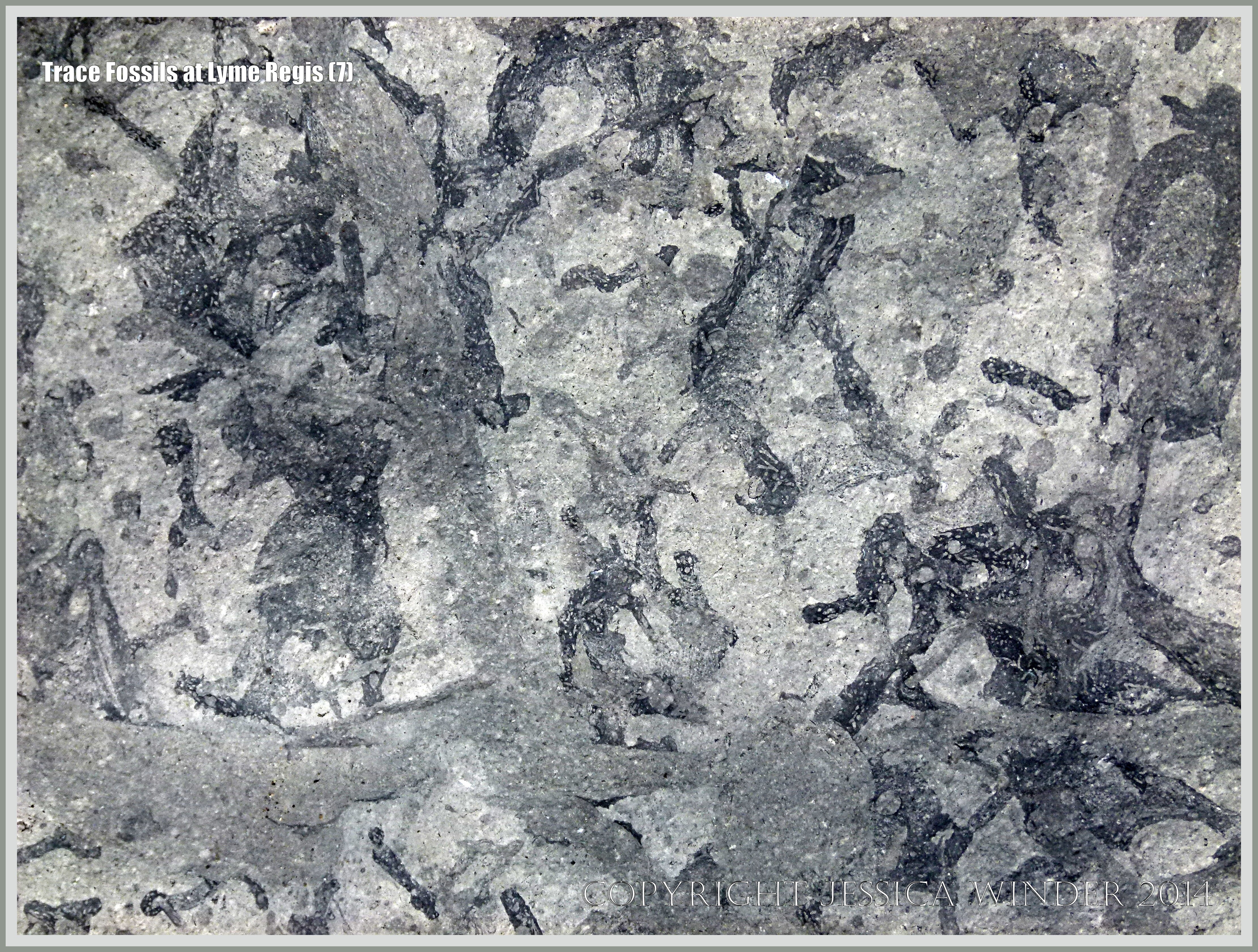 Trace Fossil Patterns At Lyme Regis 7 – Close-up of Jurassic Blue Lias Limestone rock pavement with patterns made by trace fossils of burrows left by marine invertebrates like crabs and worms. Photographed on the seashore at Monmouth Beach in Lyme Regis, Dorset, England.