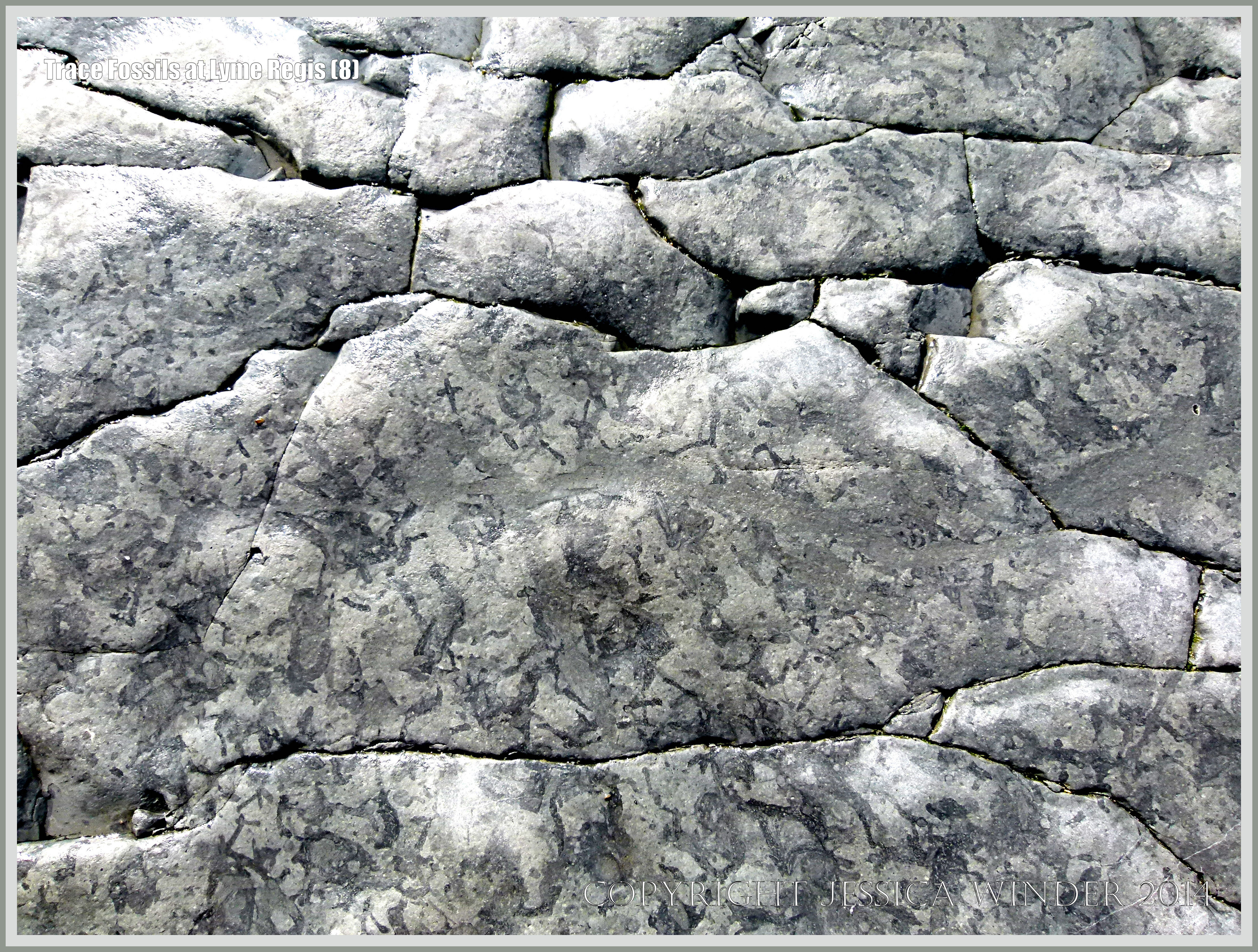 Trace Fossil Patterns At Lyme Regis 8 – Jurassic Blue Lias Limestone rock pavement with patterns made by trace fossils of burrows left by marine invertebrates like crabs and worms. Photographed on the seashore at Monmouth Beach in Lyme Regis, Dorset, England.