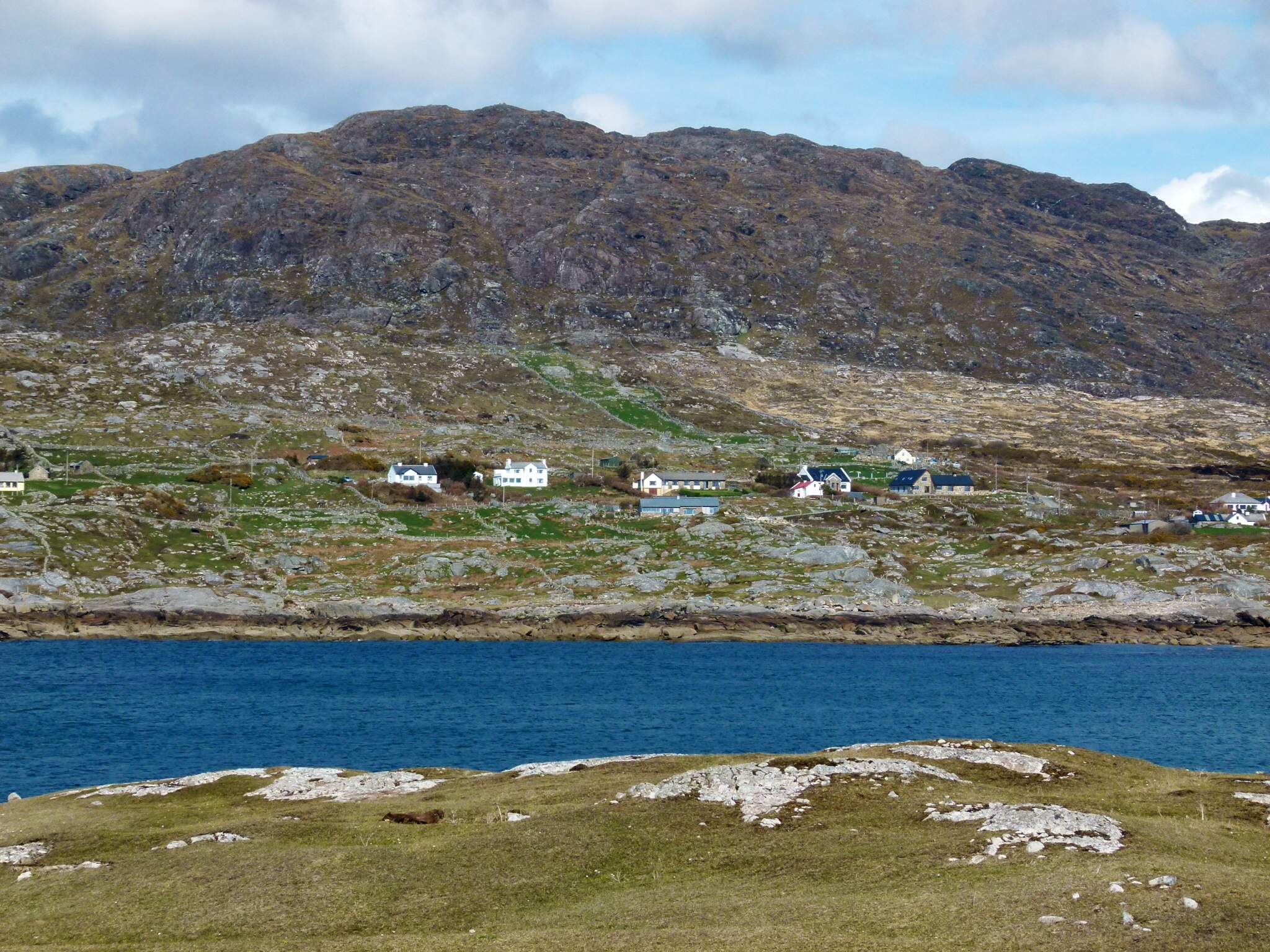 Dogs Bay 6 – View across the bright blue water from the headland towards the village at Dogs Bay in Connemara, Ireland.