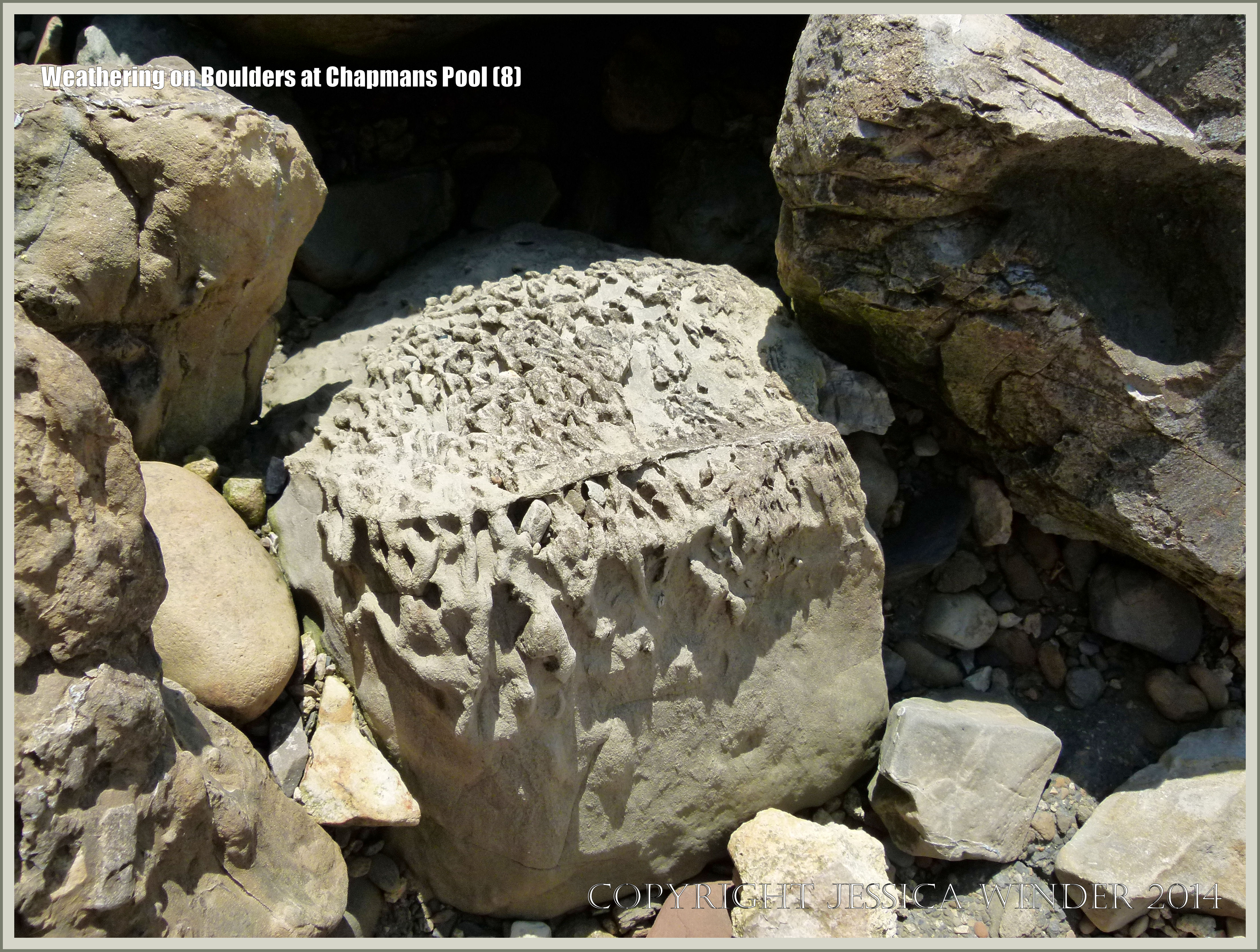 Weathering on Boulders at Chapmans Pool 8 – Weathering and erosion patterns and textures on boulders of Jurassic Period rocks on the beach at Chapmans Pool in Dorset, England, showing trace fossils of crab burrows.