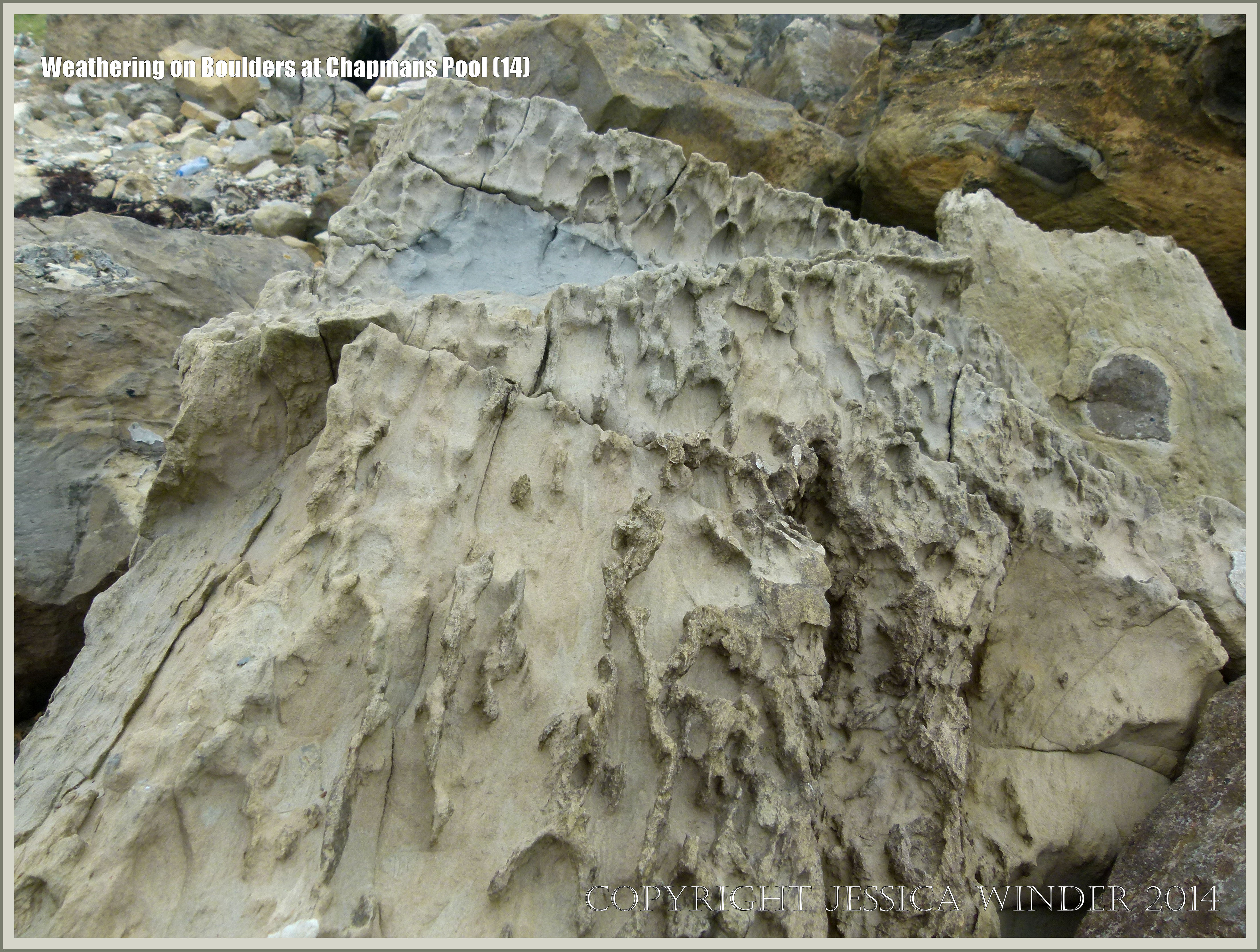Weathering on Boulders at Chapmans Pool 14 – Weathering and erosion patterns and textures on boulders of Jurassic Period rocks on the beach at Chapmans Pool in Dorset, England.