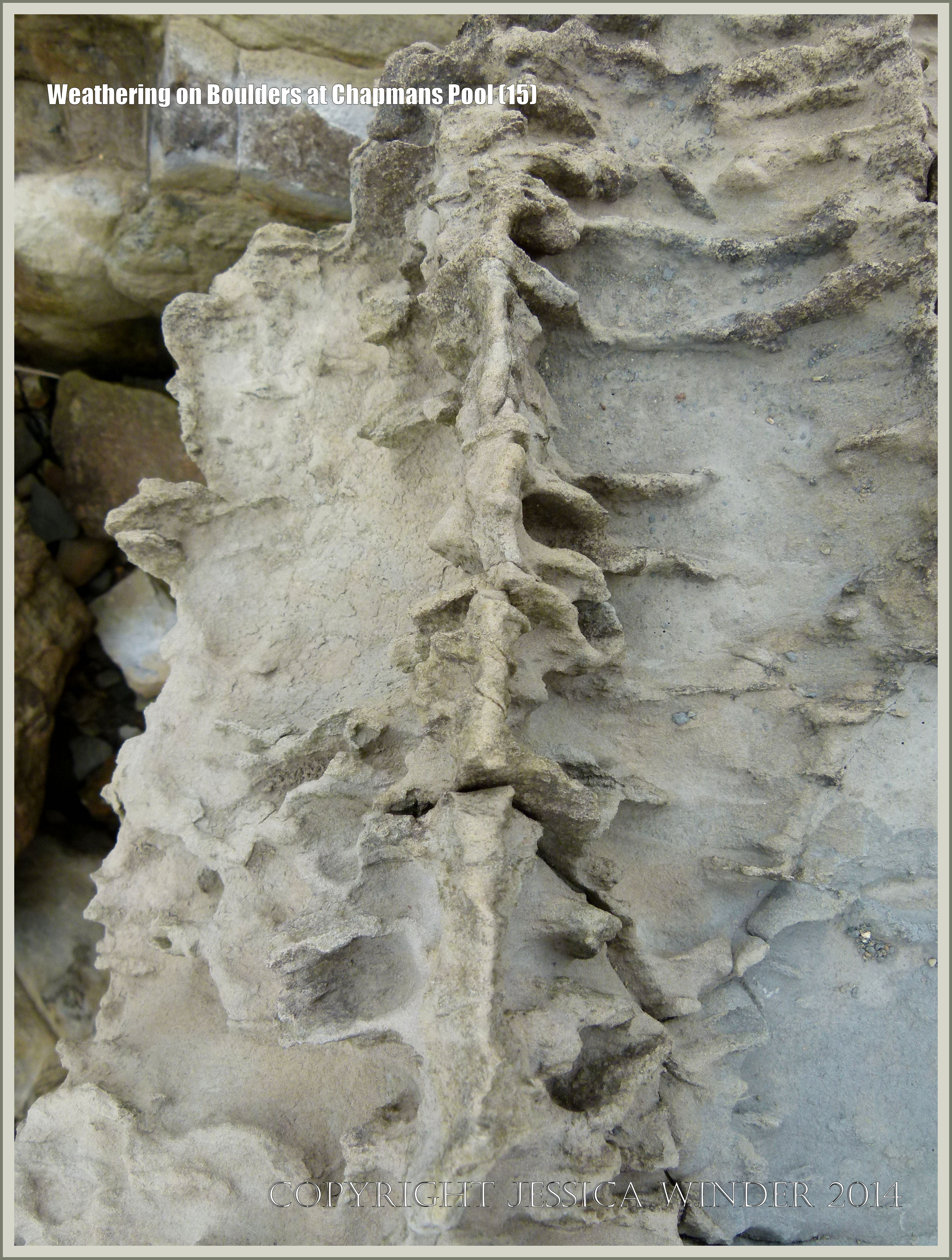 Weathering on Boulders at Chapmans Pool 15 – Weathering and erosion patterns and textures on boulders of Jurassic Period rocks on the beach at Chapmans Pool in Dorset, England.