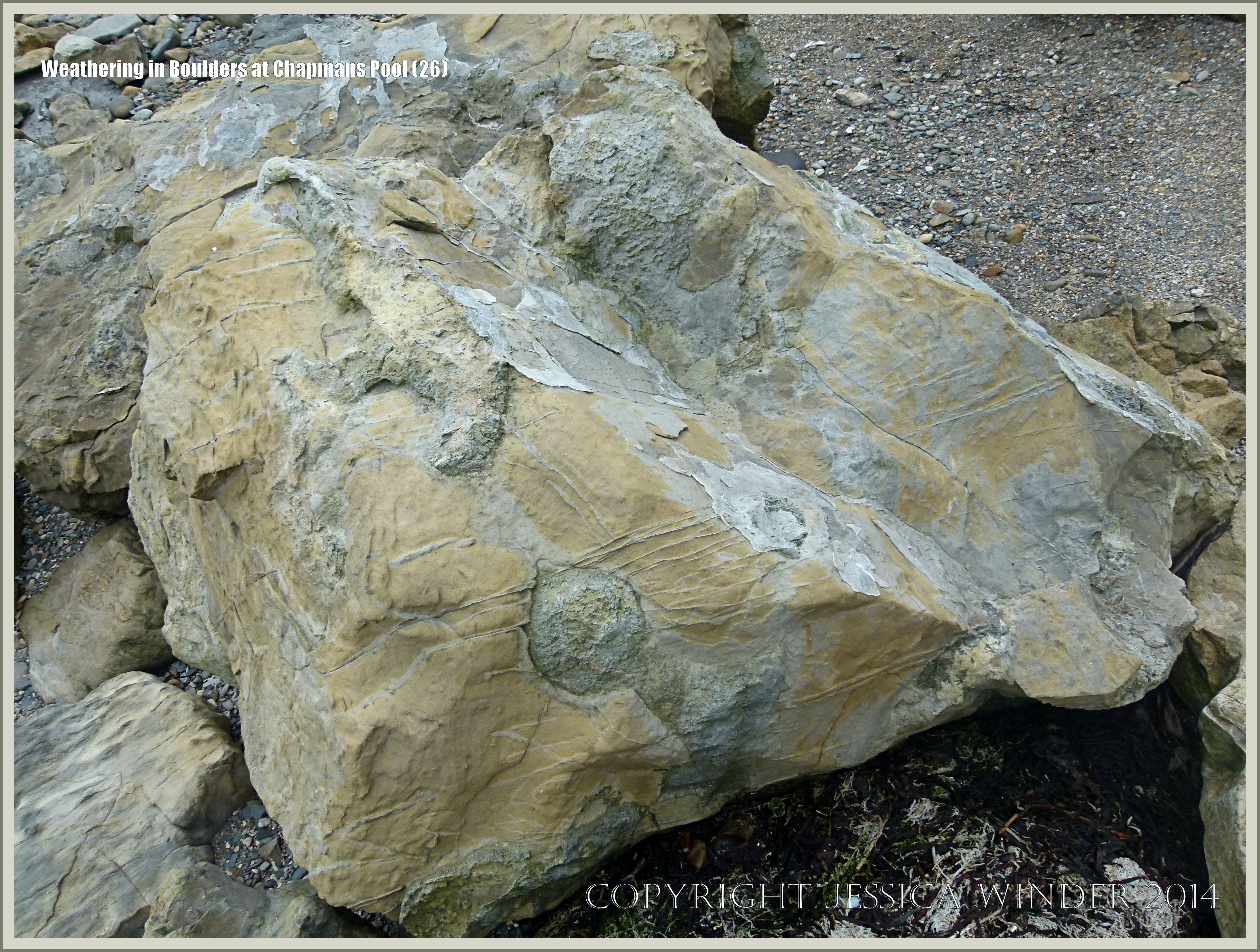 Weathering on Boulders at Chapmans Pool 26 – Weathering and erosion patterns and textures on boulders of Jurassic Period rocks on the beach at Chapmans Pool in Dorset, England.