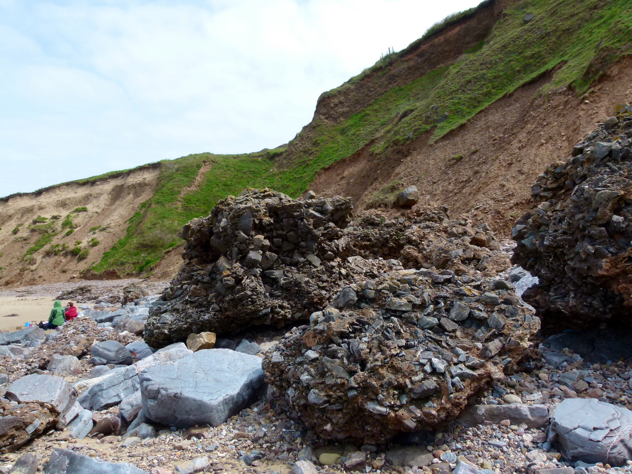Land slip at Rhossili Beach 13 – Looking up at the land slip area from the beach at Rhossili on the Gower Peninsula in South Wales, this time showing an area of both new and old rock falls further South but very close to the fall that destroyed the path.
