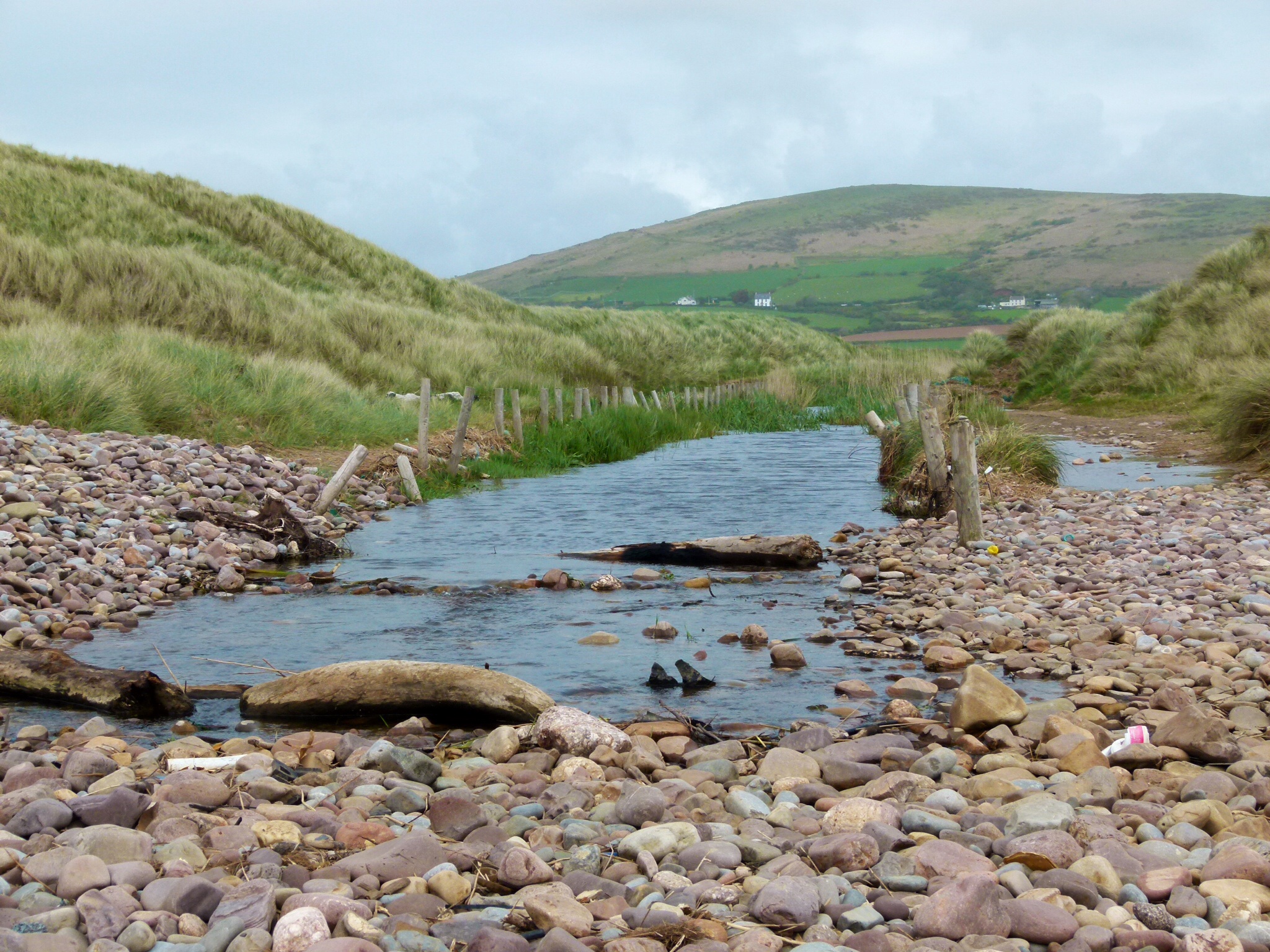 More pebbles at Rhossili 6 – Storm bank of pebbles damming the stream known as Diles Lake as it flows from Llangennith Marshes across Rhossili beach in Gower, South Wales.