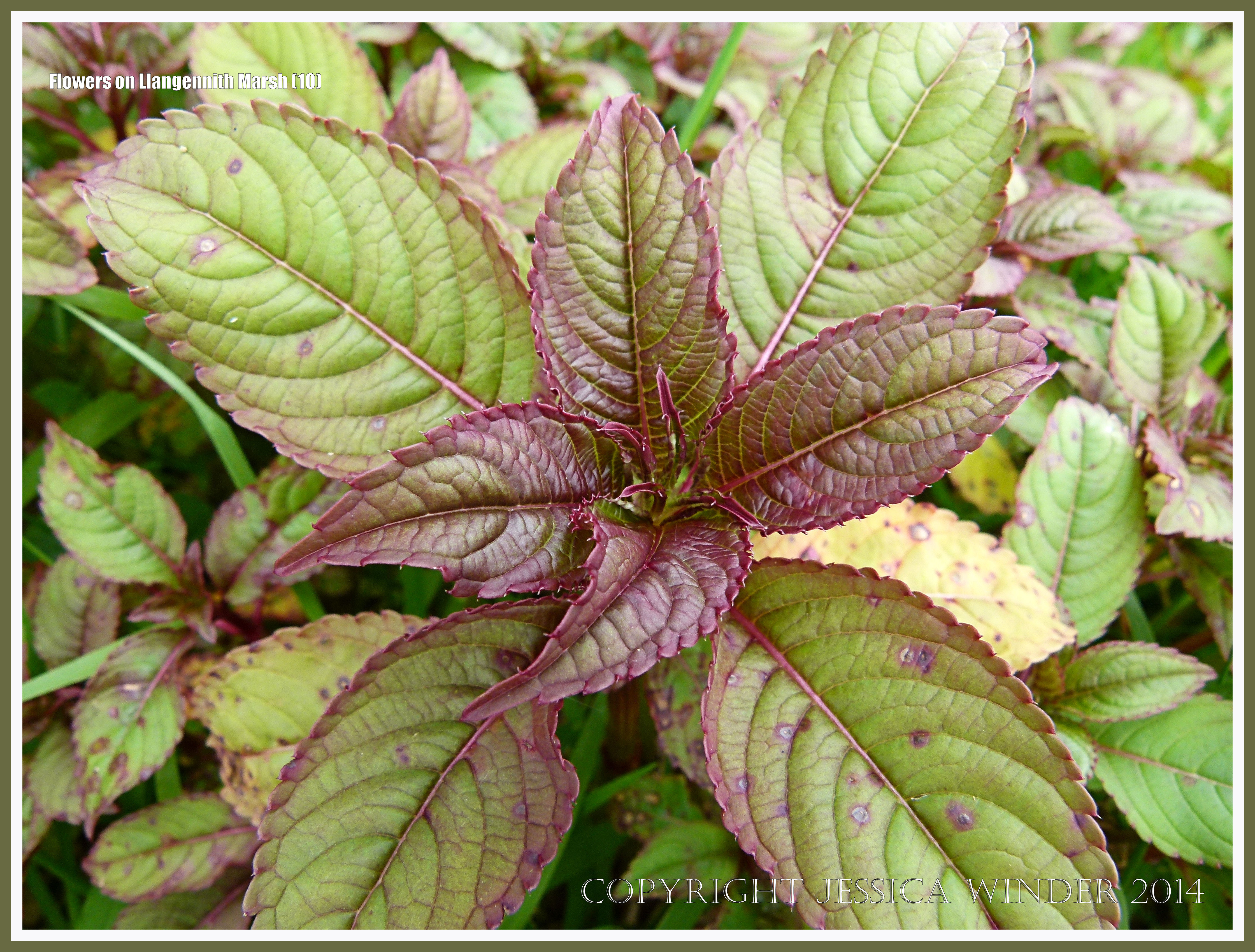 Flowers Of Llangennith Marsh 10 – Wild plants, thought to possibly be new growth the introduced Himalayan Balsam, by a water-filled ditch on Llangennith Marsh near Rhossili on the Gower Peninsula in South Wales.