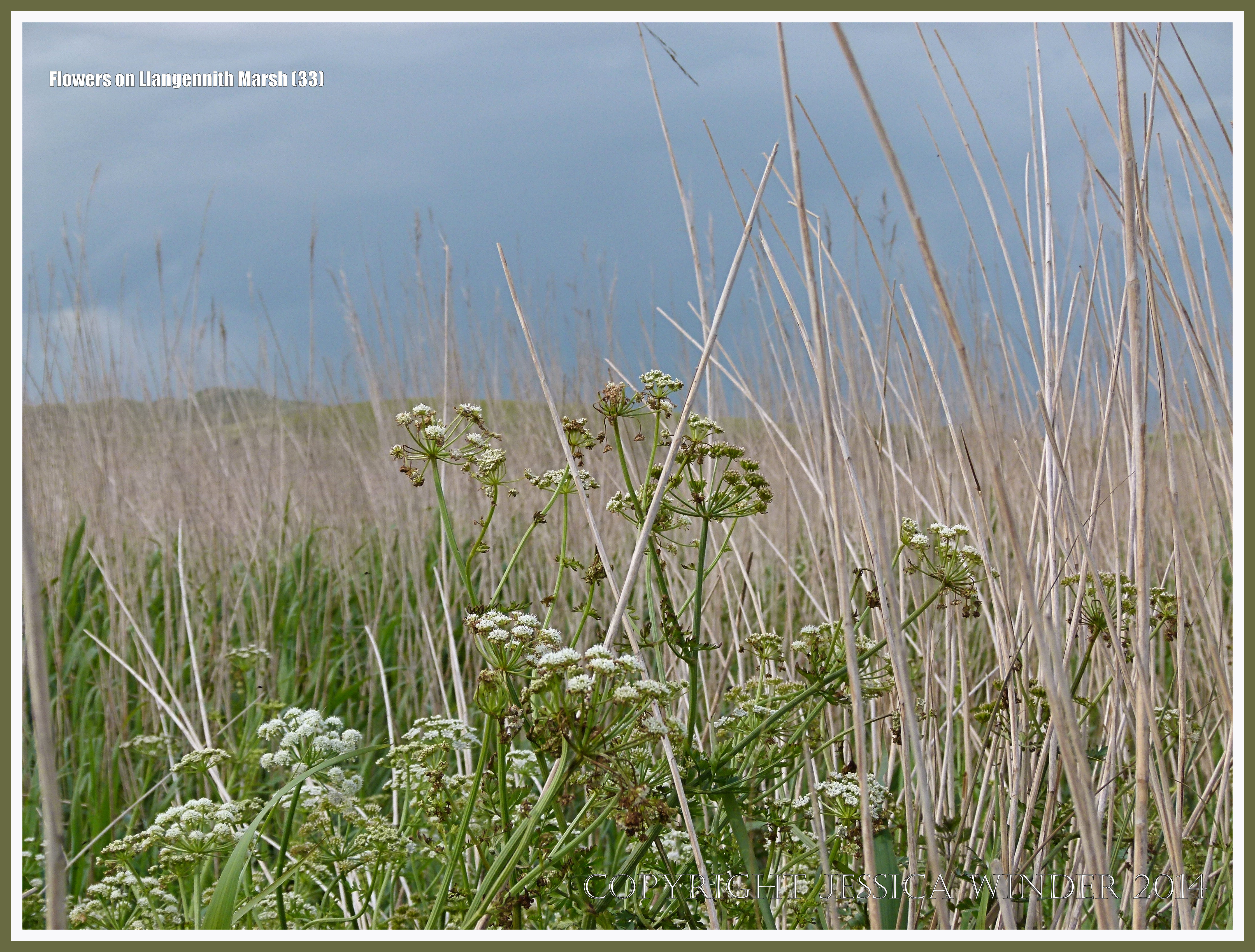 Flowers of Llangennith Marsh 33 – Dry reed beds and white flowers growing on Llangennith Marsh near Rhossili on the Gower Peninsula in South Wales.