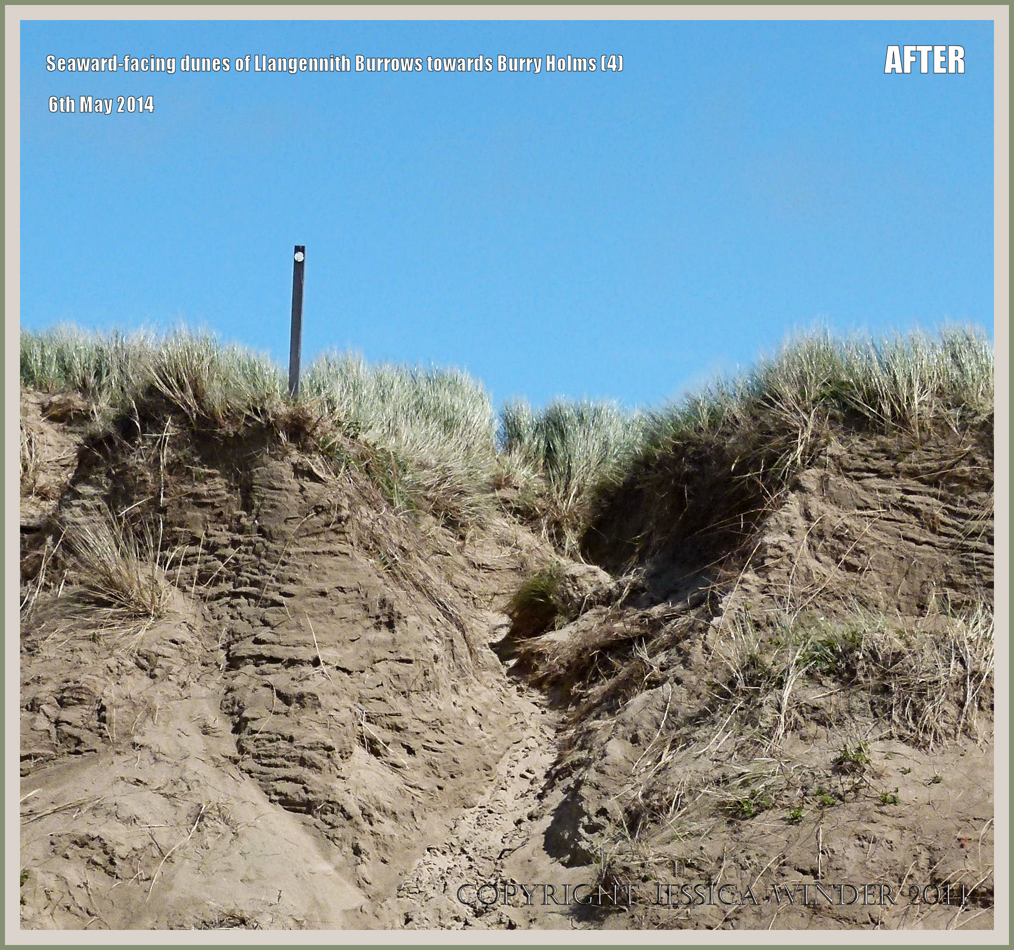 Shoreline Changes at Llangennith Burrows 4 – The altered appearance of the seaward-facing sand dunes of Llangennith Burrows at the north end of Rhossili Beach on 6th May 2014, showing the effects of erosion of sand producing a steep near vertical slope down to the shore, removal of vegetation, and the footpath a steep gouge to the right of the signpost. Photographed on the Gower Peninsula, South Wales.