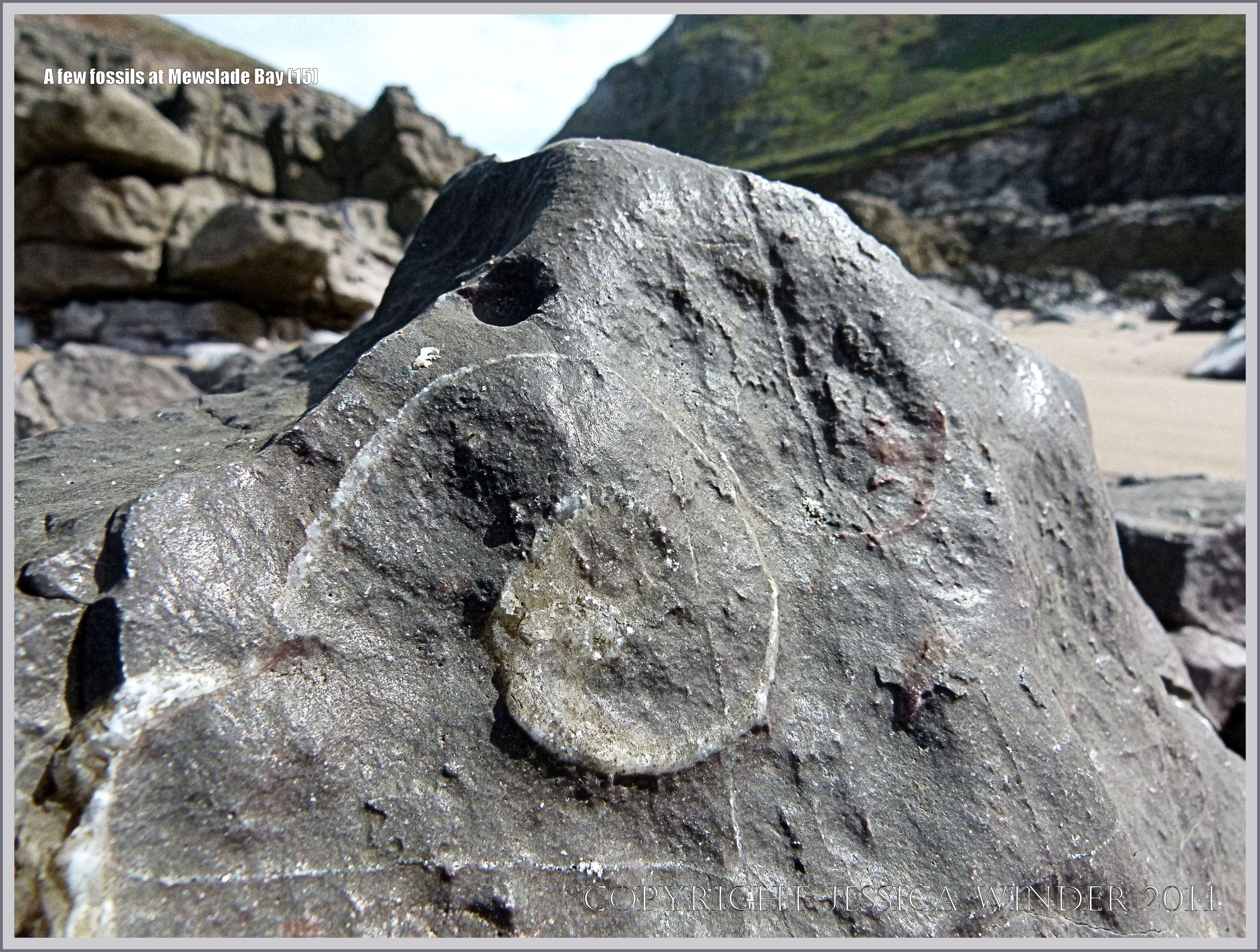 A few fossils at Mewslade Bay 15 – Fossil gastropod mollusc in Carboniferous Limestone on the beach at Mewslade Bay on the Gower Peninsula in South Wales.