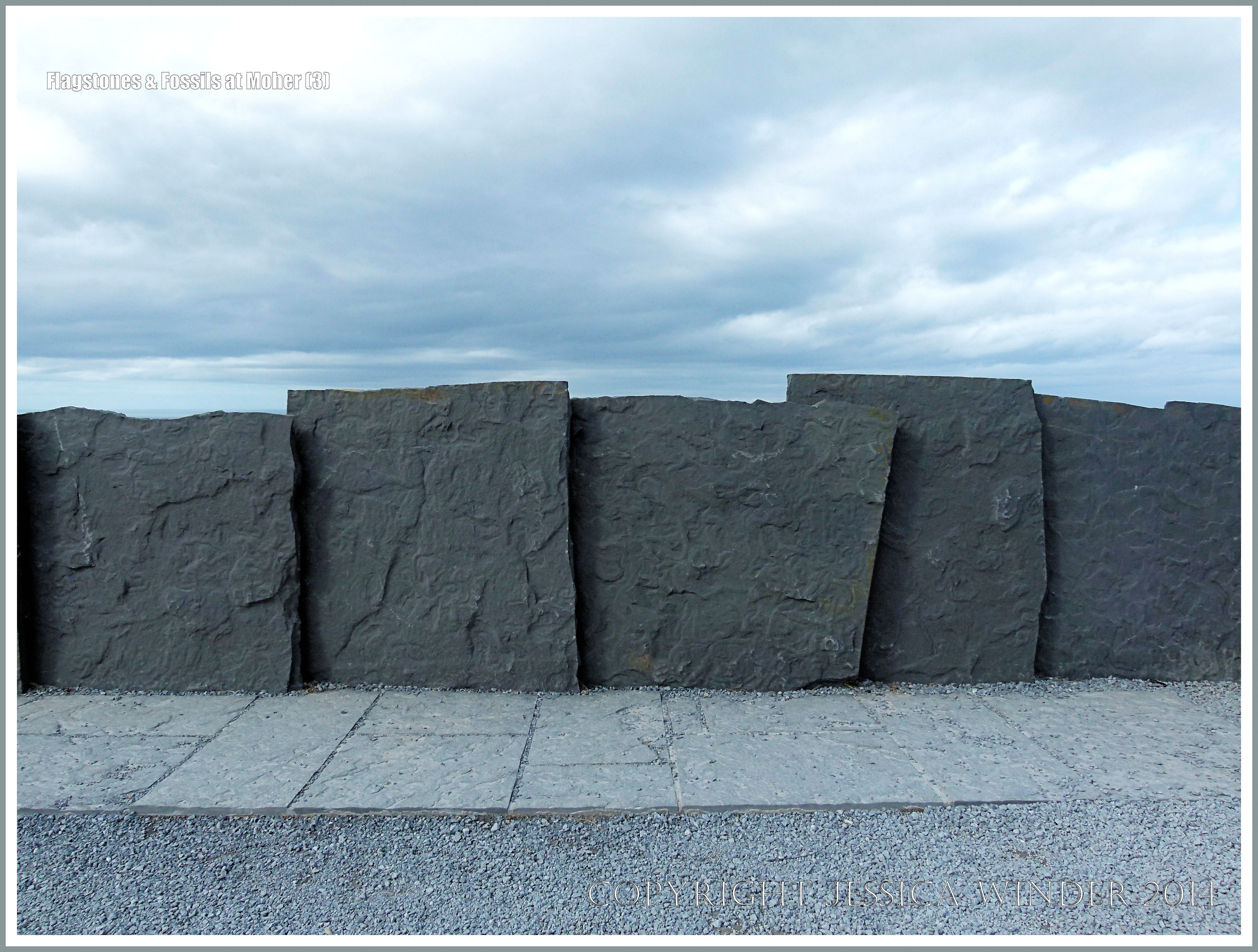 Flagstones & Fossils at Moher 4 – Overlapping vertical slabs of Liscannor flagstone with abundant ichnofossils forming a protective barrier wall at the cliff edge at the Cliffs of Moher on the west coast of Ireland in County Clare.