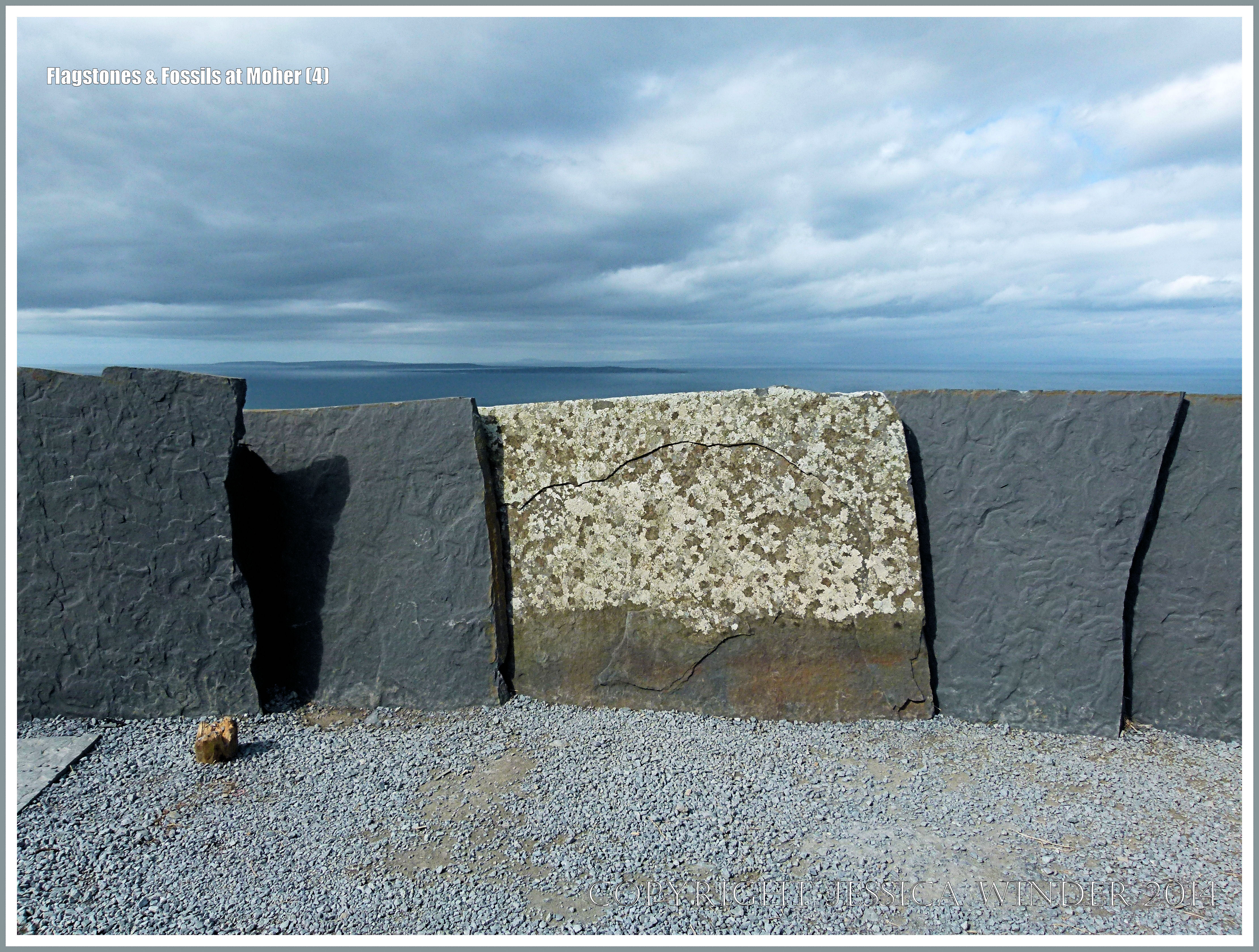Flagstones & Fossils at Moher 4 – Overlapping vertical slabs of Liscannor flagstone with abundant ichnofossils forming a protective barrier wall at the cliff edge at the Cliffs of Moher on the west coast of Ireland in County Clare. For some reason, occasional slabs are covered with lichen while others are clean.