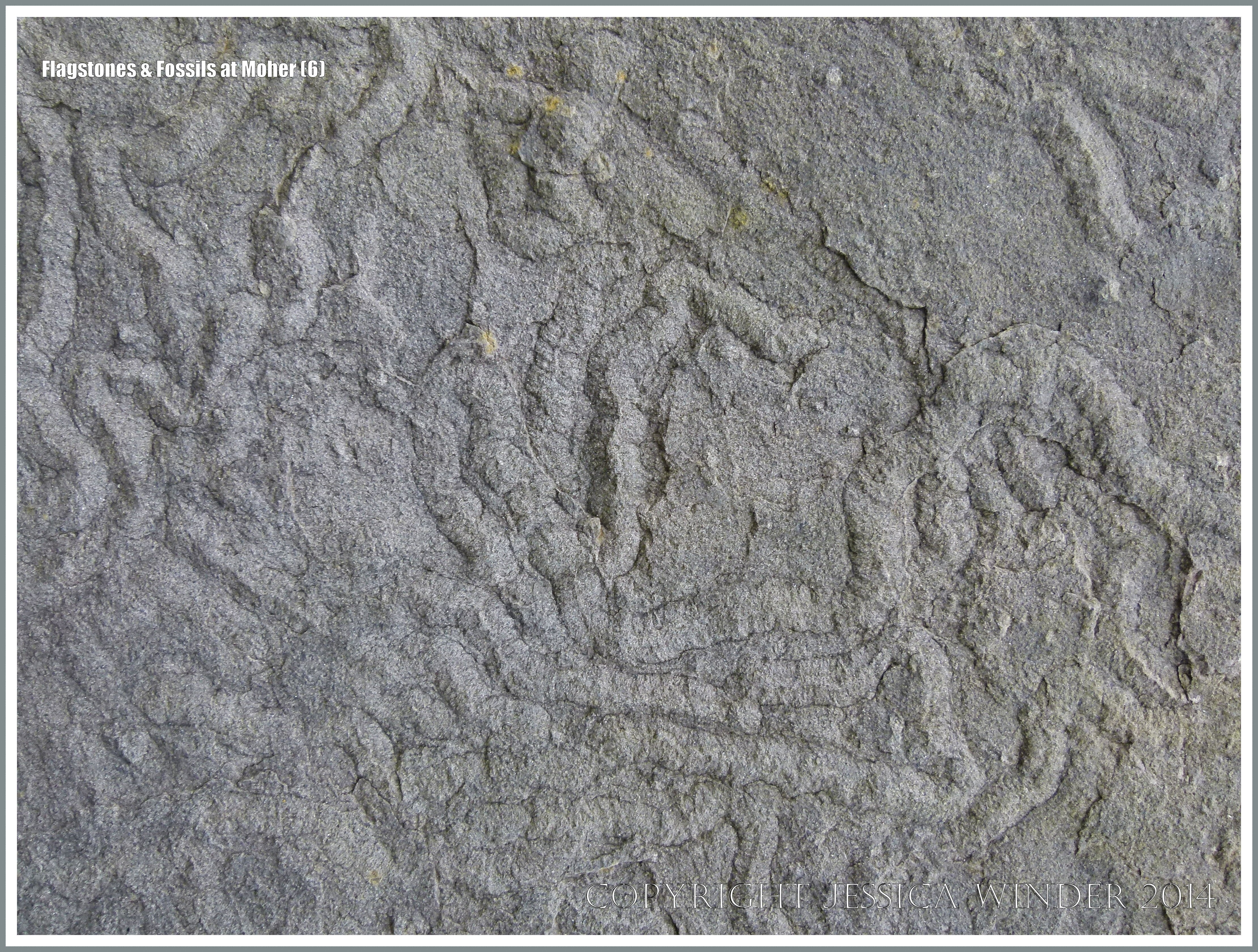 Flagstones & Fossils at Moher 6 – Liscannor flags with Olivellite trace fossils in a barrier wall at the Cliffs of Moher on the west coast of Ireland in County Clare.