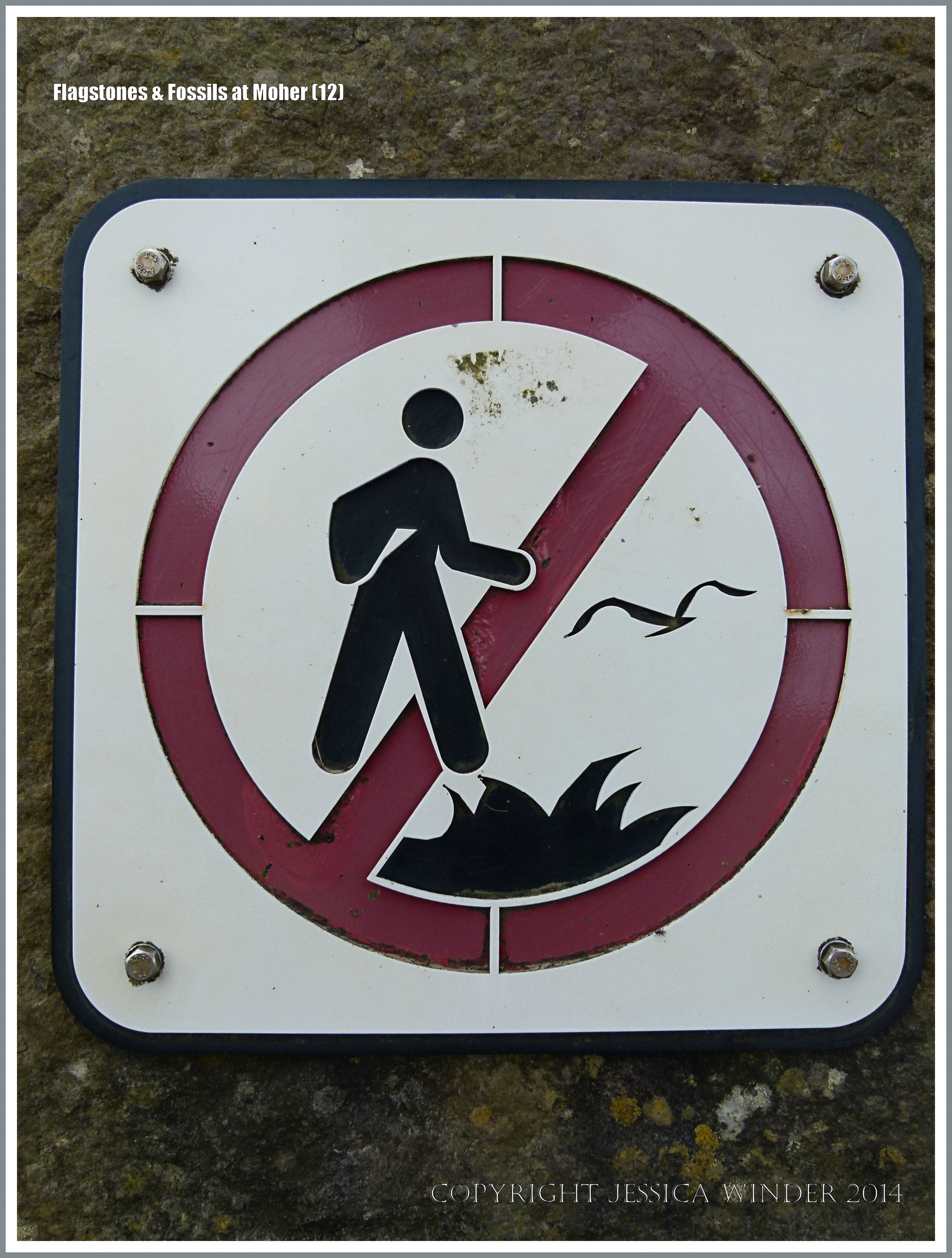 Flagstones & Fossils at Moher 12 – Warning sign against walking on cliff edge and disturbing wildlife. at the Cliffs of Moher on the west coast of Ireland in County Clare.