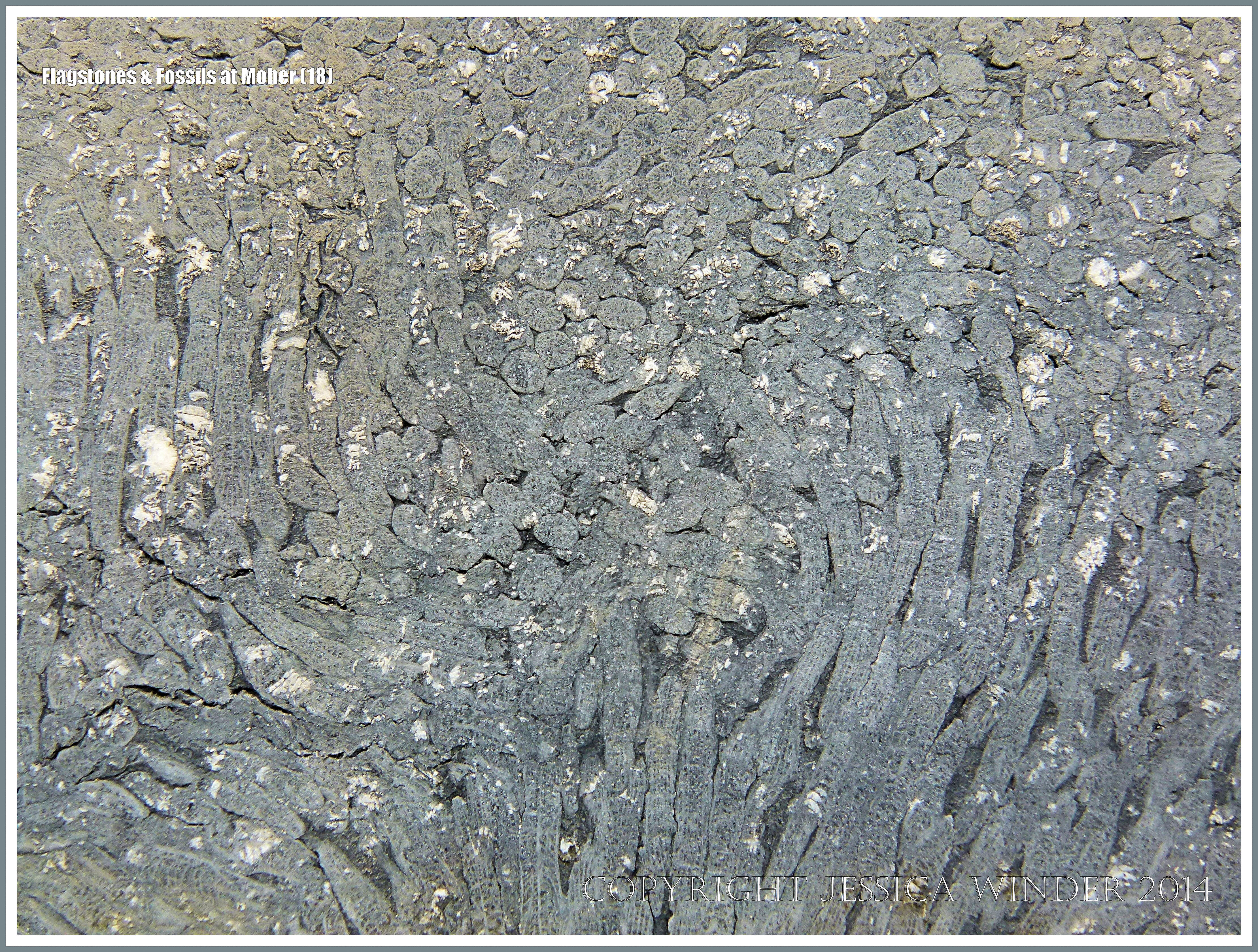 Flagstones & Fossils at Moher 18 – Fossil colonial corals in Carboniferous limestone from the Burren, forming the riser stones of steps at the Cliffs of Moher on the west coast of Ireland in County Clare.