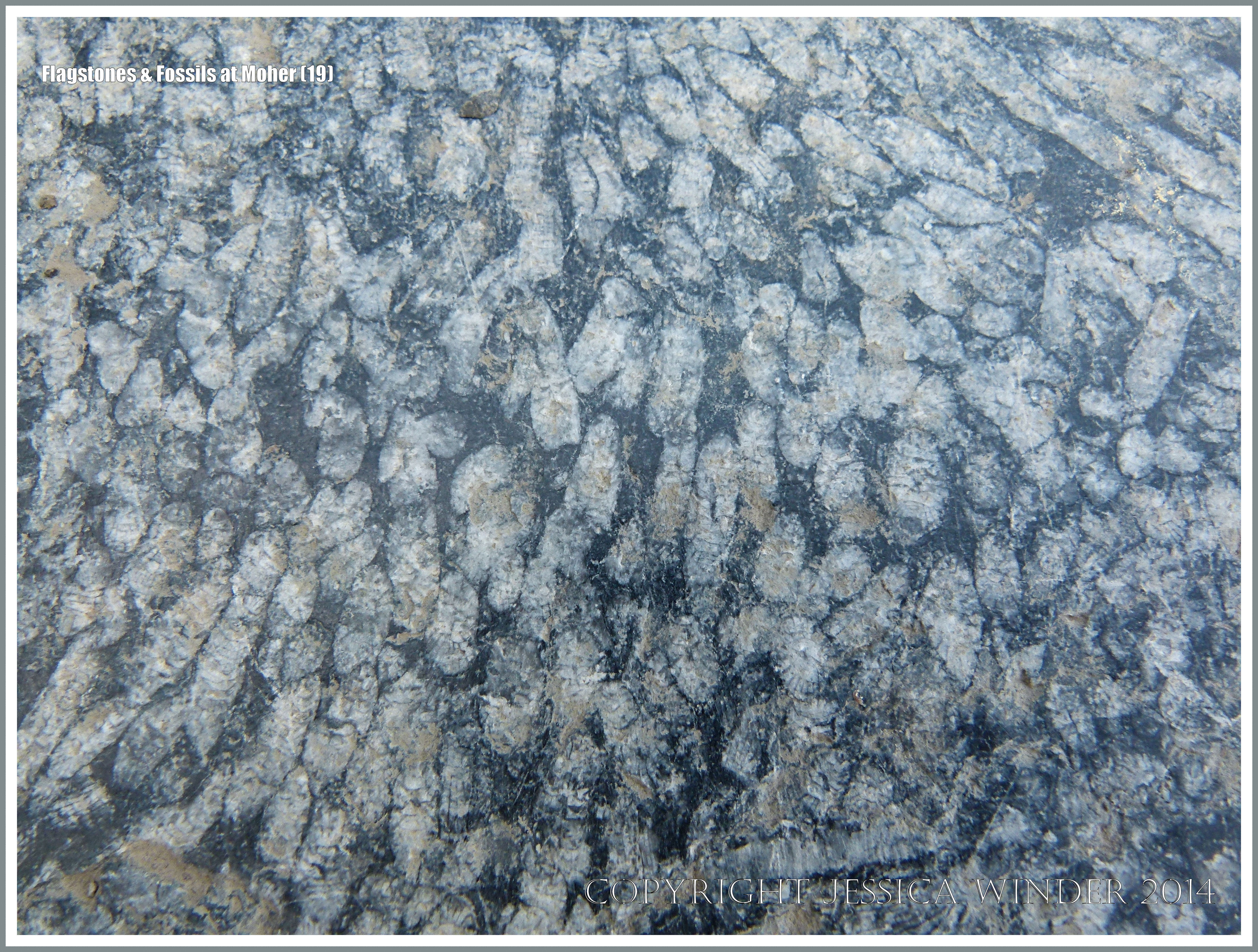 Flagstones & Fossils at Moher 19 – Fossil colonial corals in Carboniferous limestone from the Burren, forming the riser stones of steps at the Cliffs of Moher on the west coast of Ireland in County Clare.