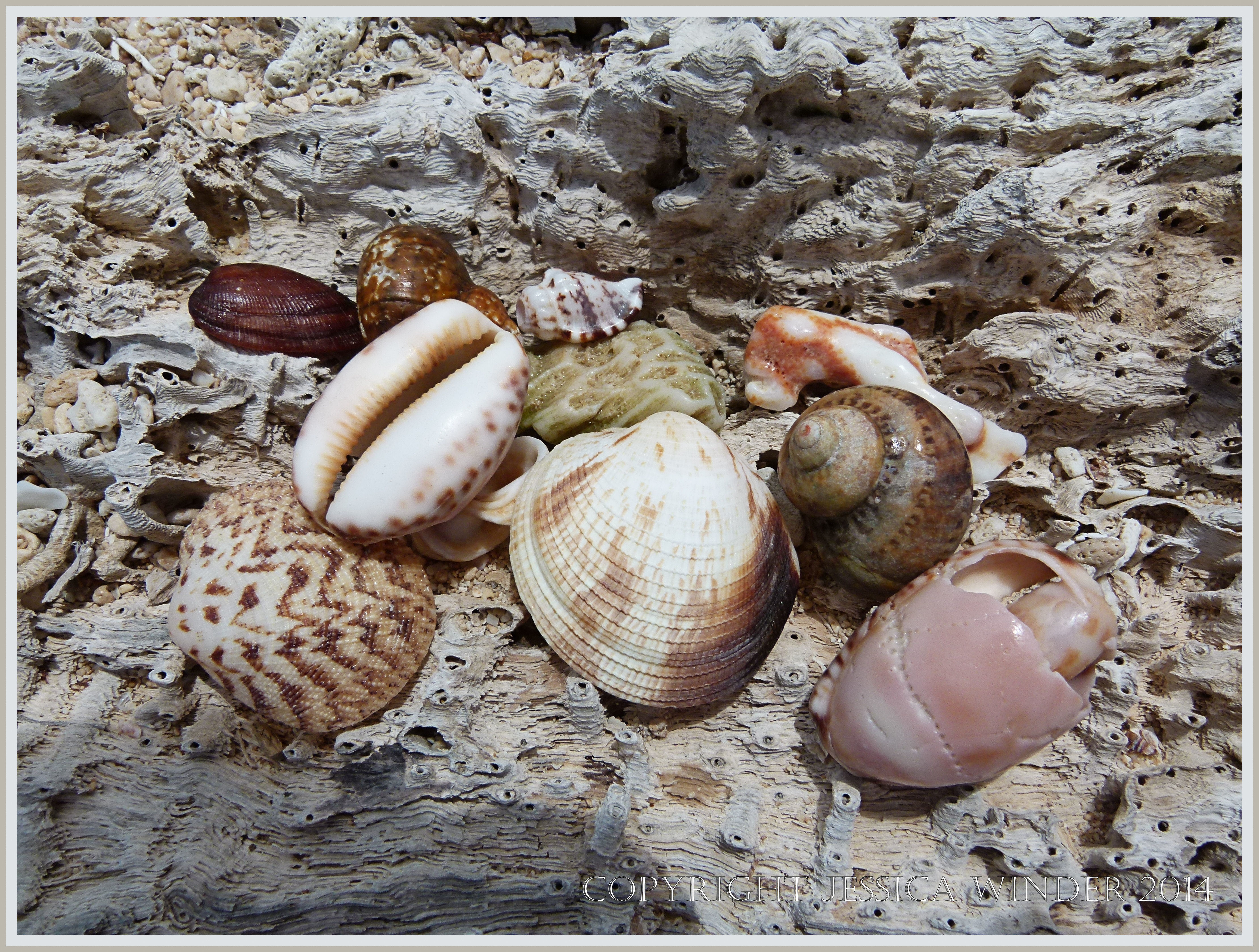 A Walk Around Normanby Island 1.10 – Assorted beach-combed seashells on weathered driftwood on the beach at Normanby Island off the Queensland coast in Australia.