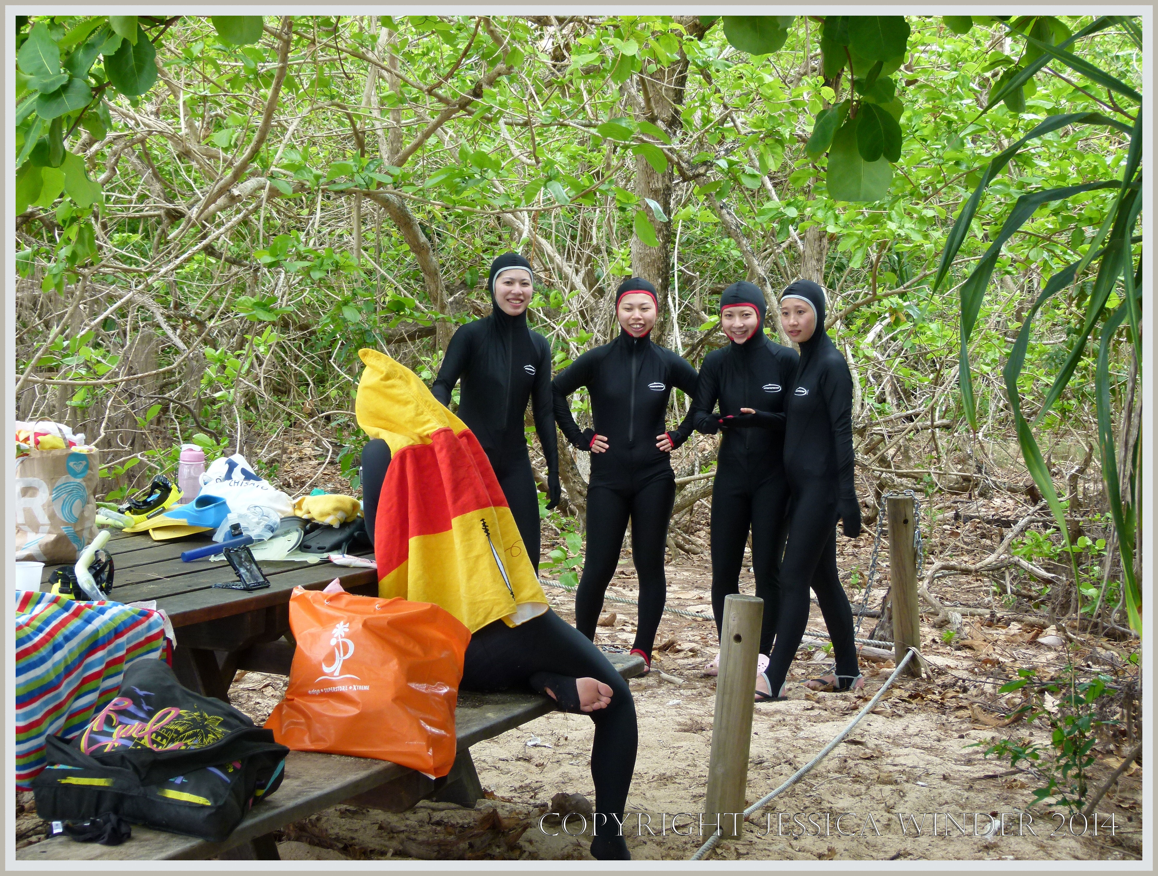 A Walk Around Normanby Island 1.15 – Young Japanese girls wearing “stinger suits” as protection from Box Jellyfish while diving off Normanby Island in the Frankland Islands Group in Queensland, Australia.