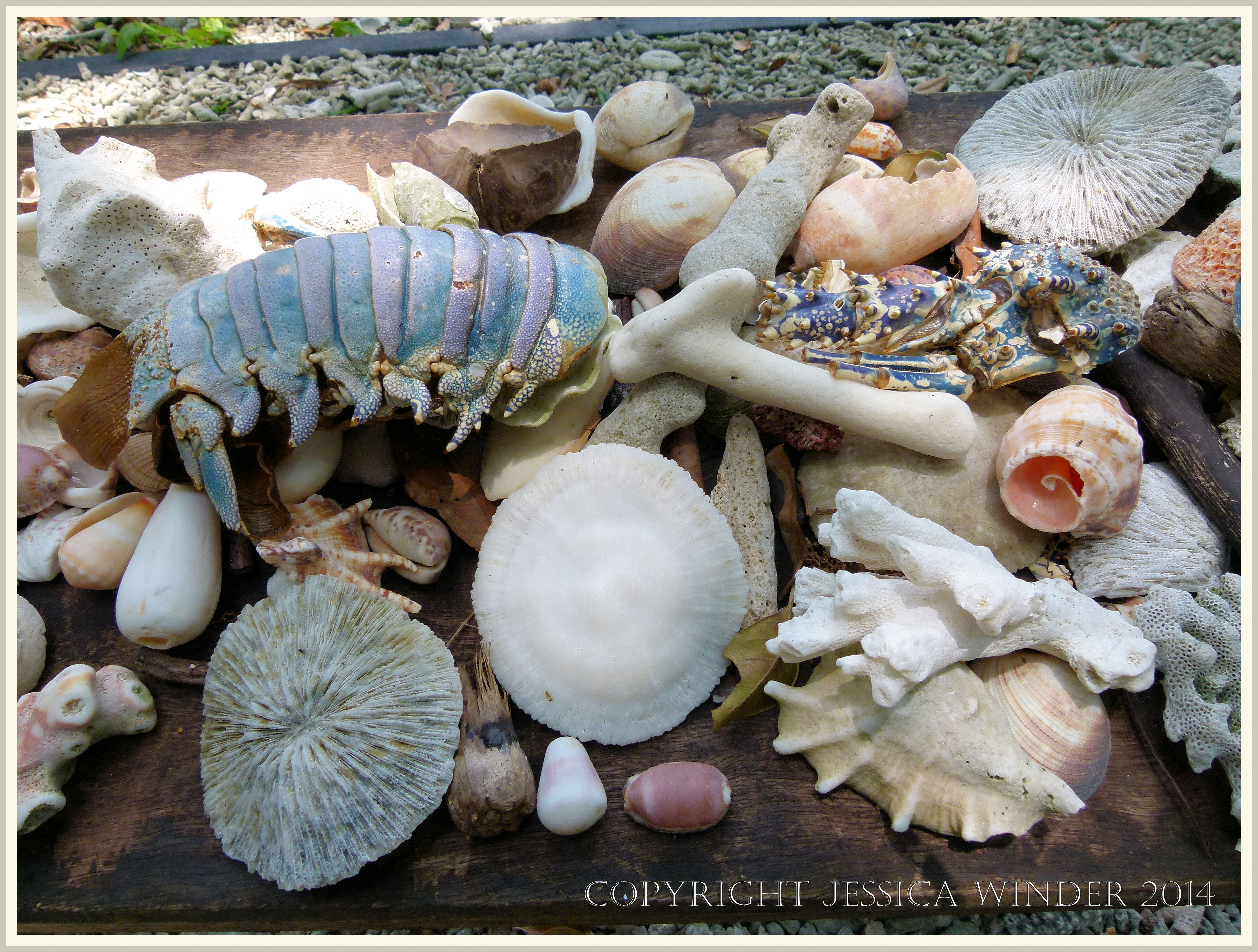 Normanby Island Walk 2.26 – Beachcombed finds of shells and coral displayed on a table hidden in the trees at Normanby Island off the Queensland coast in Australia.