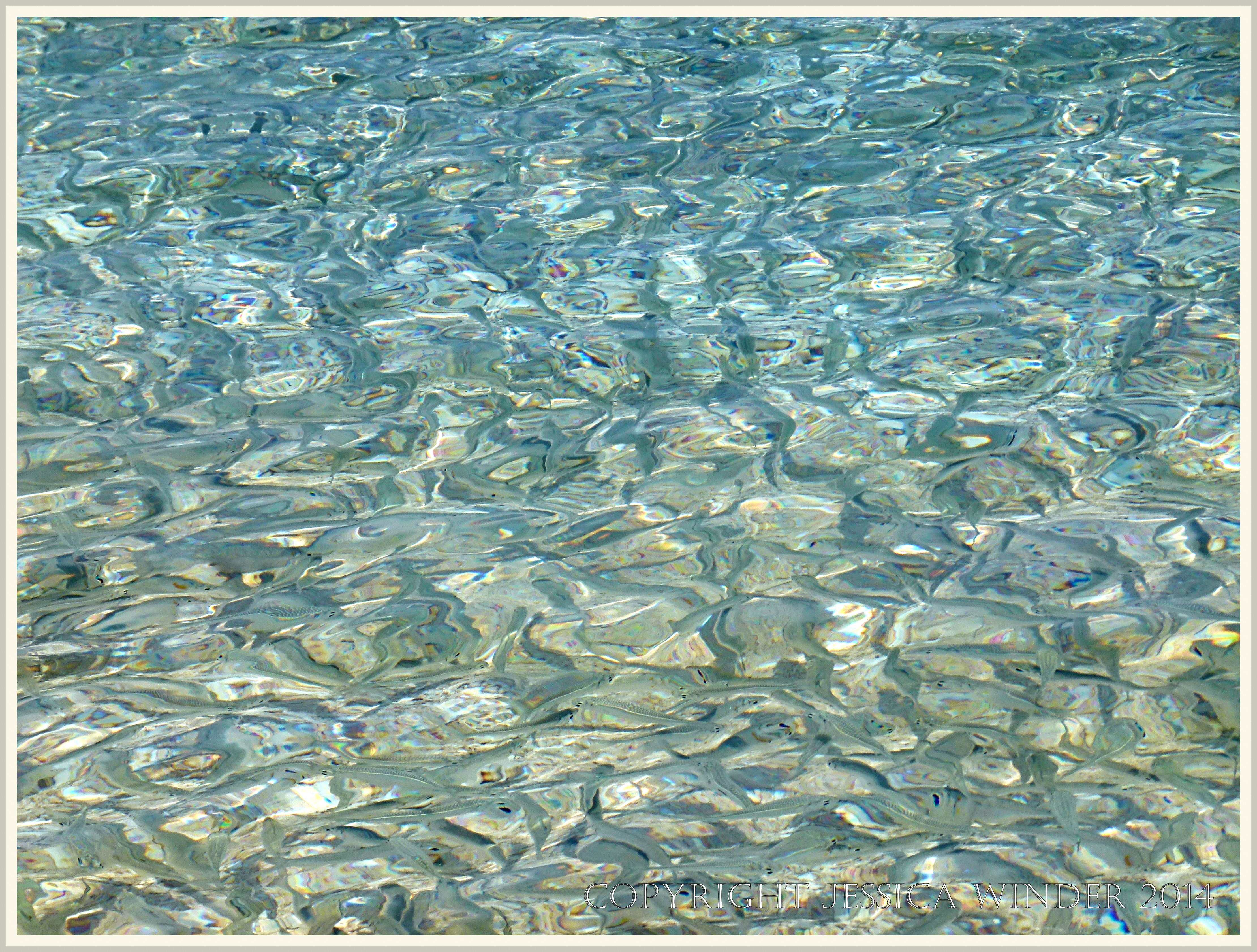 Normanby Island Walk 2.24 – Water pattern with fish shoal in shallow water at the beach on Normanby Island off the Queensland coast in Australia.