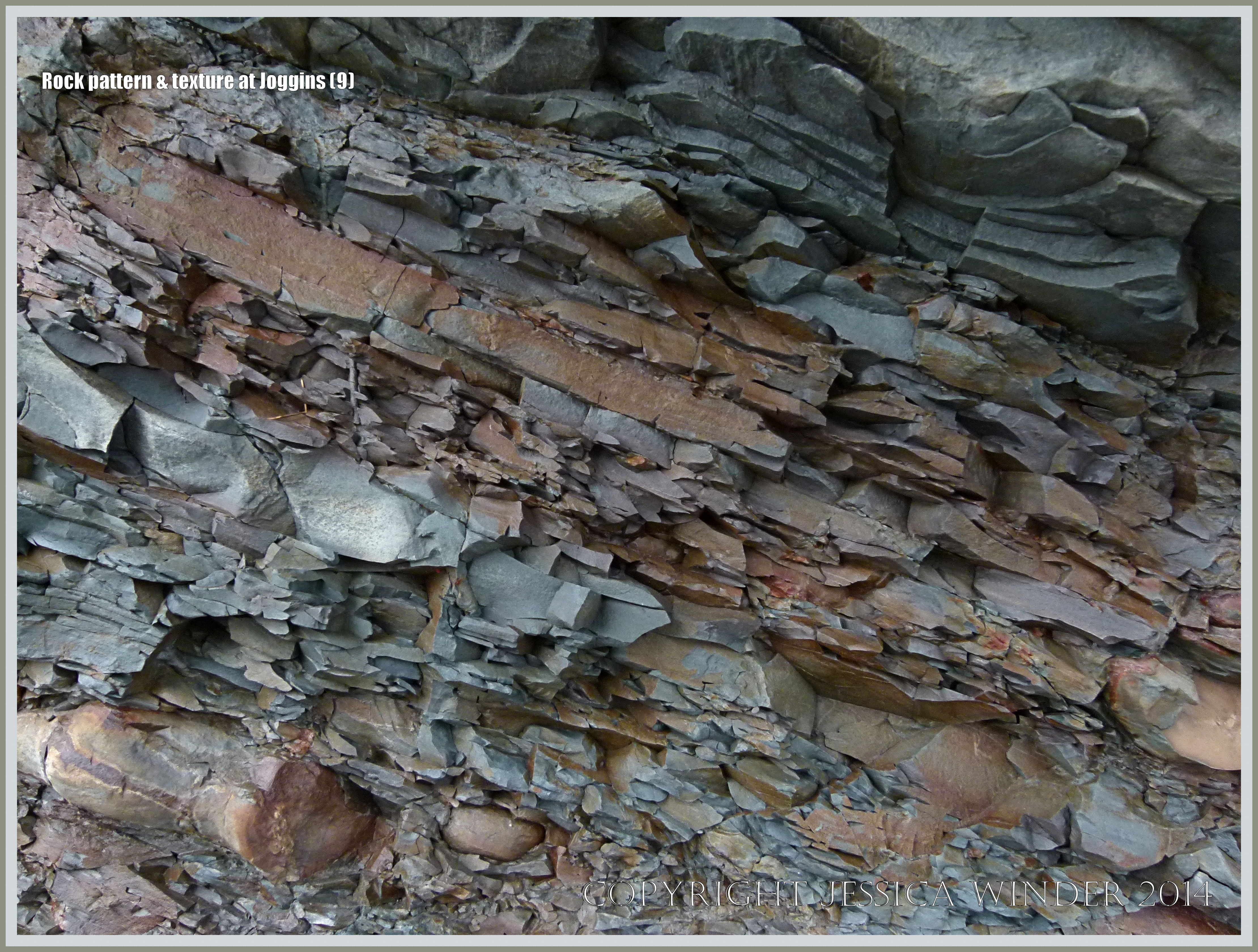 Rock Pattern & Texture at Joggins 9 – Detail of the natural pattern and texture of Upper Carboniferous Period sedimentary rock strata at Joggins Fossil Cliffs the Nova Scotia shore of the Bay of Fundy in Canada.