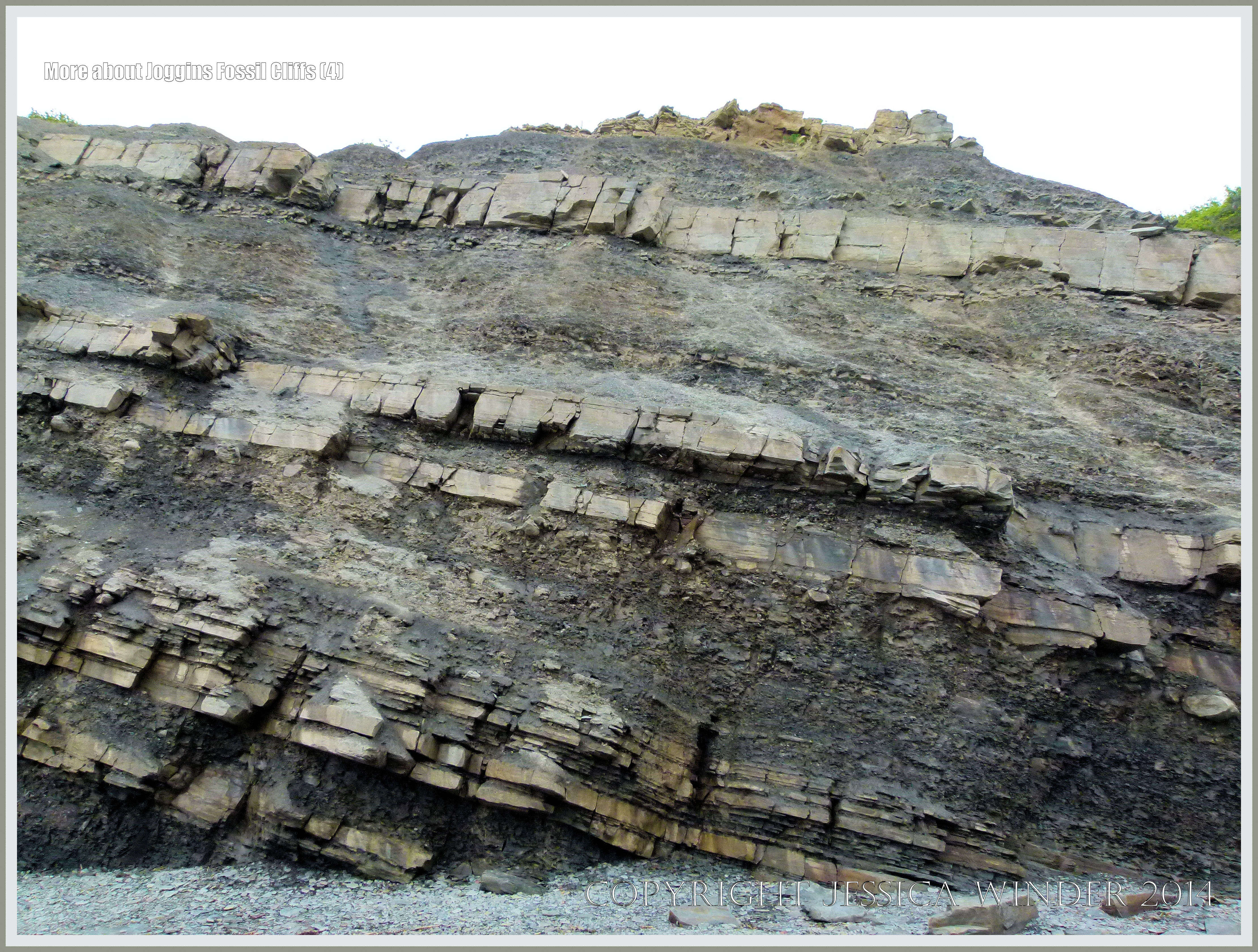 More about Joggins Fossil Cliffs 4 – Rock strata inclined at an angle of about 20 degrees at Joggins Fossil Cliffs in Nova Scotia, Canada.