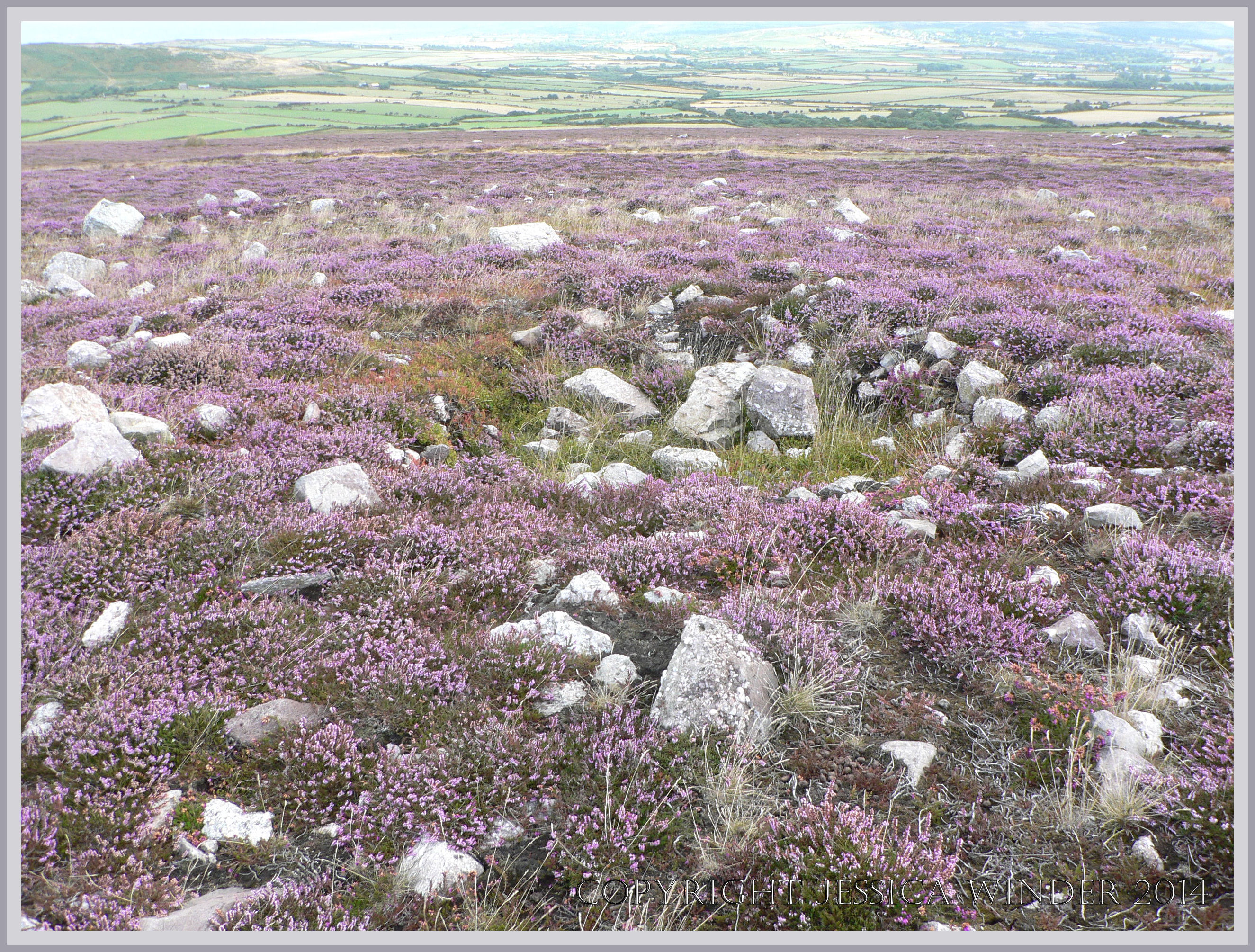 Sweynes Howse 9 – View on top of Rhossili Down showing the junction between the stone and heath-covered upland in the foreground with the more fertile lowland in the background, on the Gower Peninsula in South Wales.