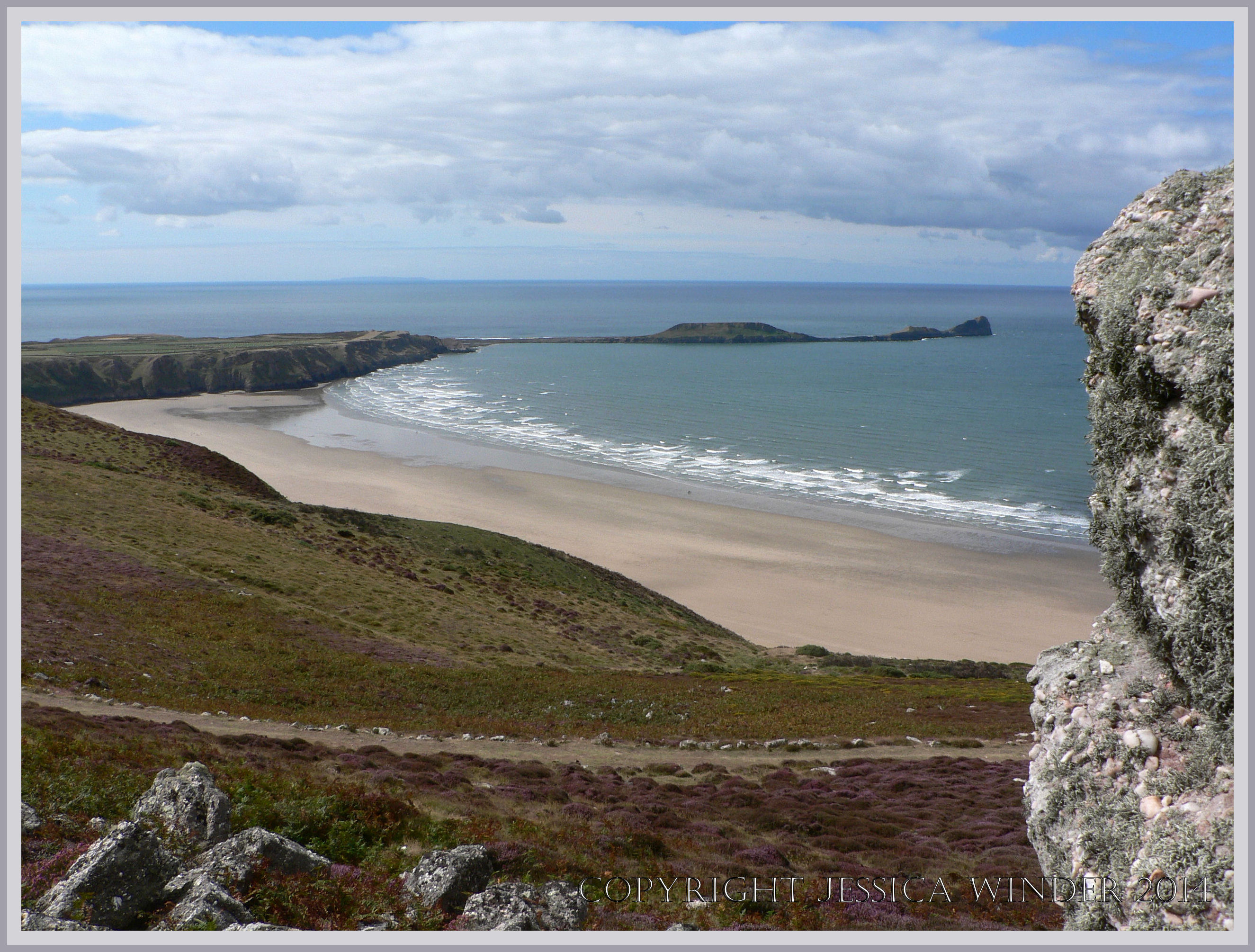 Sweynes Howse 7 – View of the Worm’s Head and Worm’s Head Causeway (where the possible ancient axe head was found) from up on Rhossili Down on the Gower peninsula, South Wales