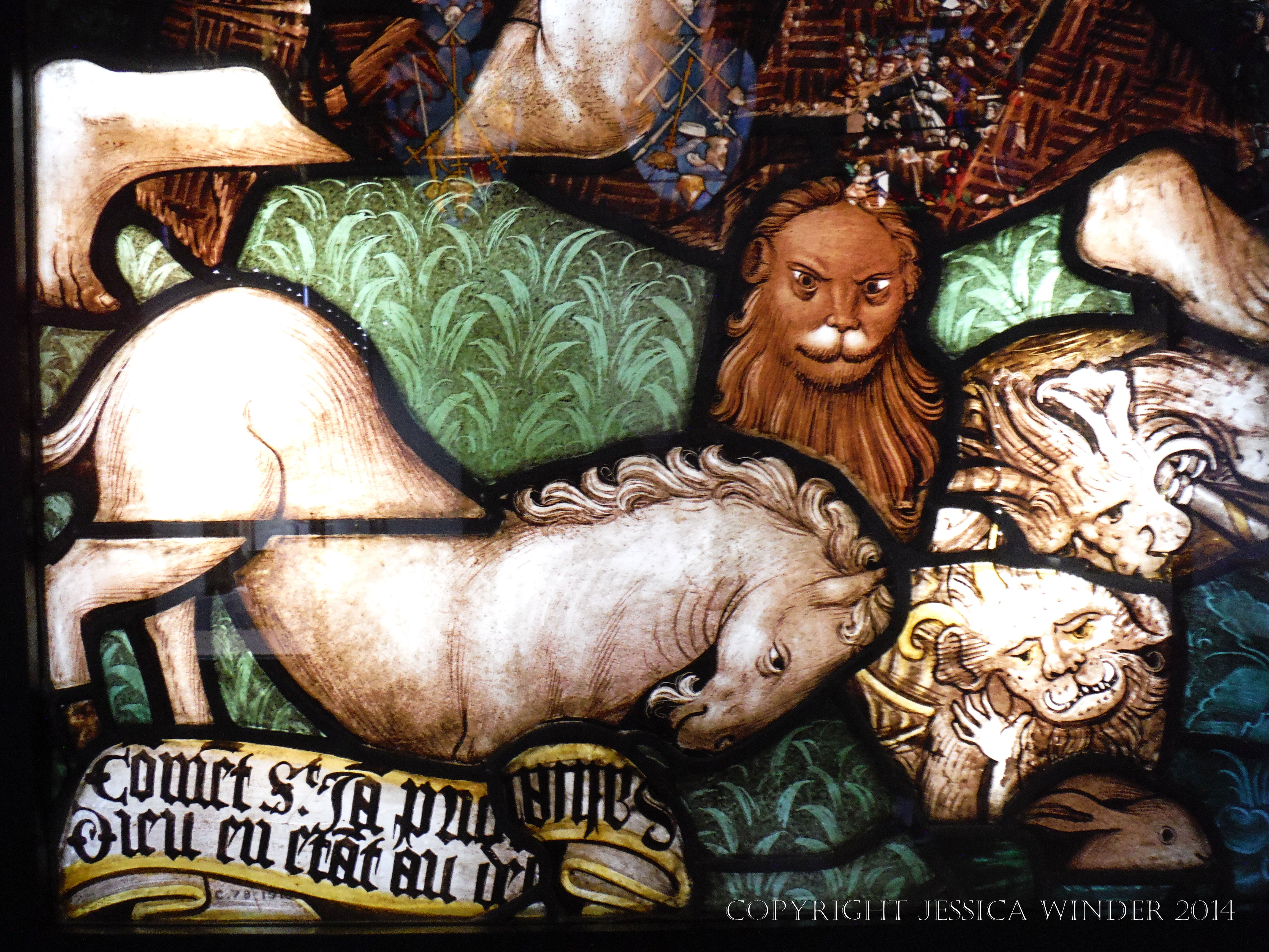 Animals at the V&A Museum 1 – Animals in a stained glass window called “The Eternal” by Ruth Taylor Jacobsen, commissioned by the V&A in 2003 through the John Cohen Foundation as background display to the Judaica Exhibition. It uses traditional imagery used in Judaic art, e.g. Lion of Judah, stag symbol of the Naphtali Tribe, and eagle representing God’s protection (Museum No. C.17:1-3-2005)