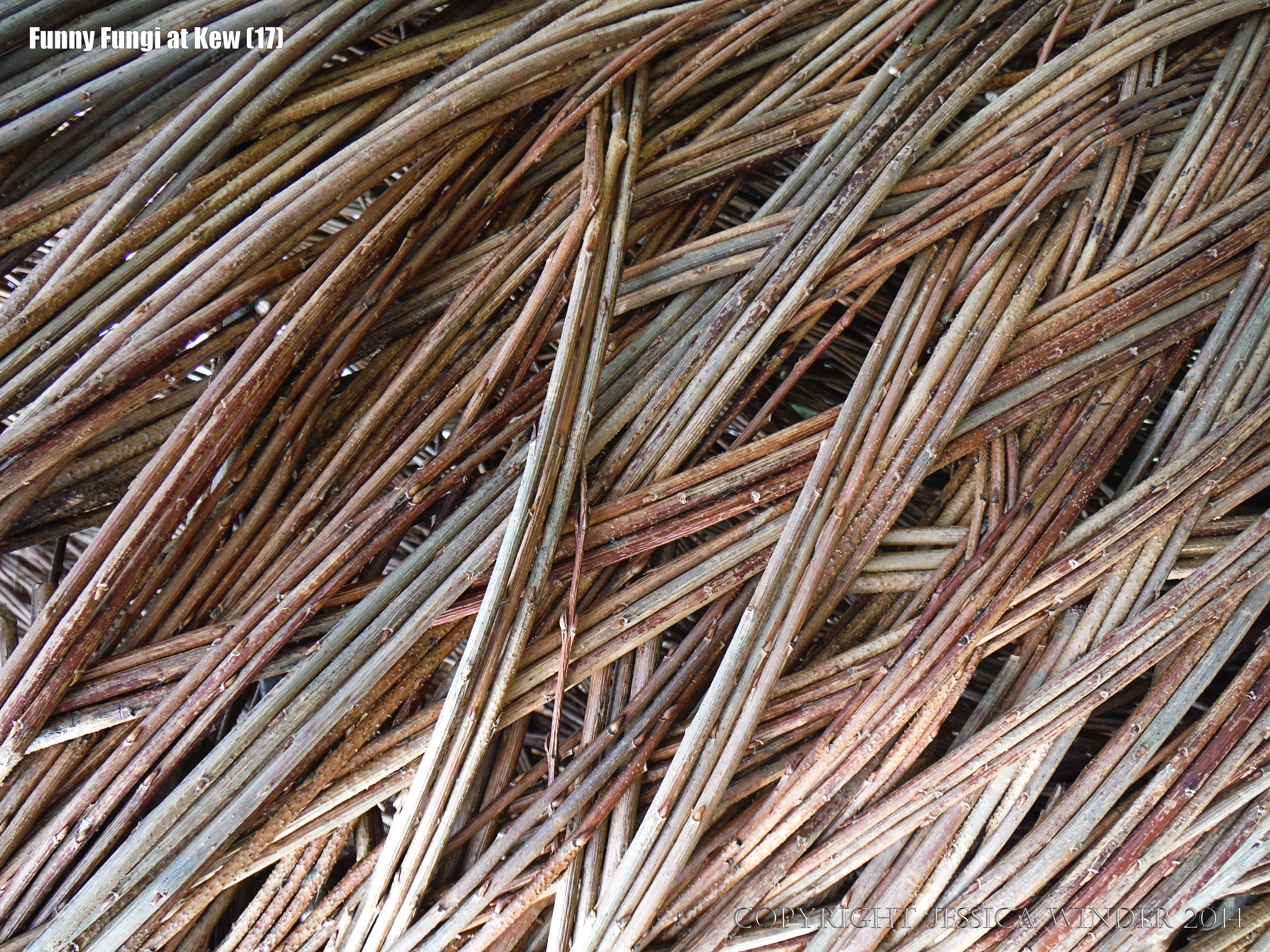 Funny Fungi at Kew 17- Close-up of the basketwork weaving in a larger than life willow sculpture of fungi (some well over 2 metres high) by Tom Hare at Kew Gardens, London, in September 2013