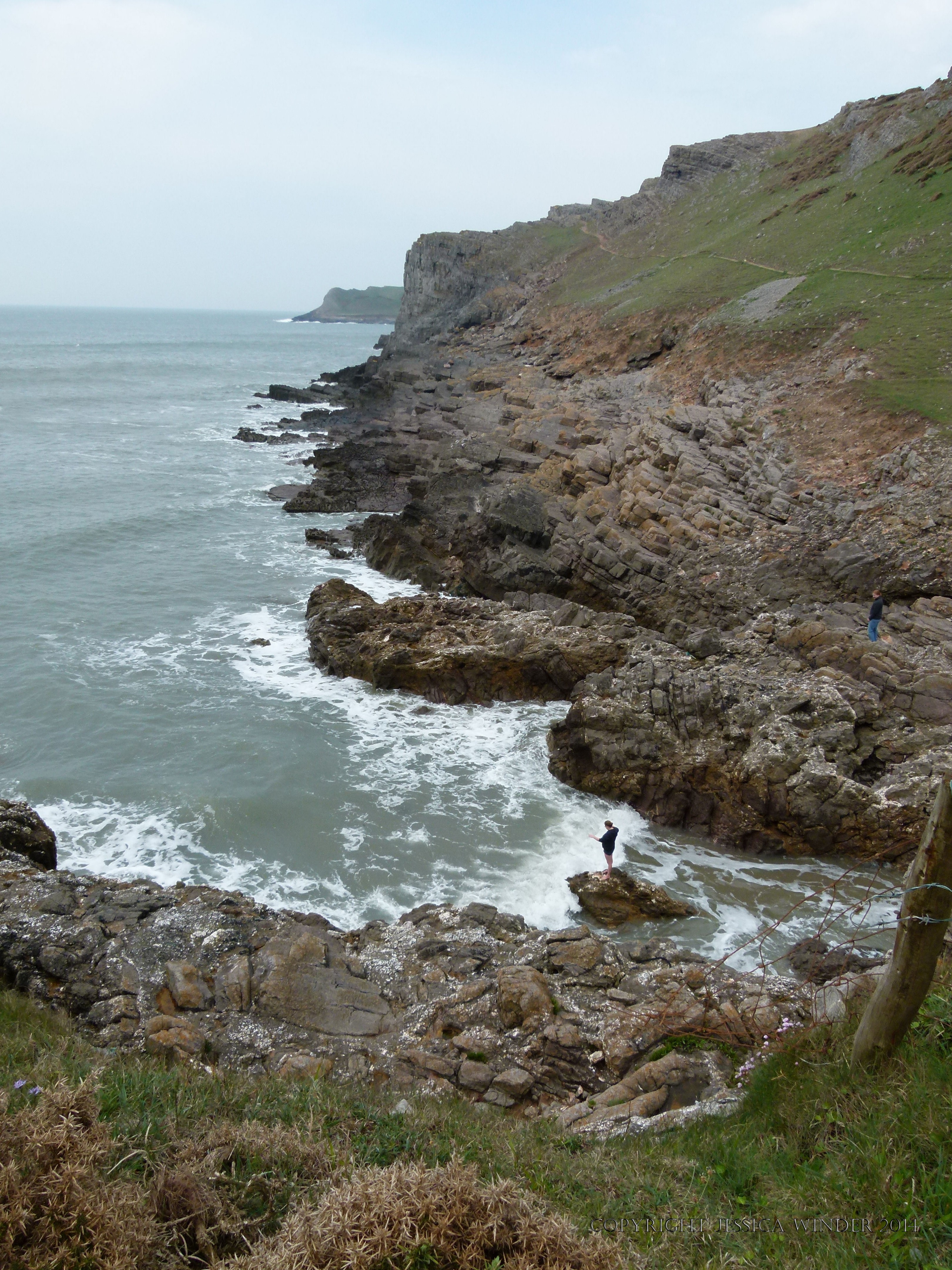 May Walk to Mewslade Bay 21 – View looking west along the South Gower Coast from the slopes of Thurba Head at Mewslade Bay in South Wales.
