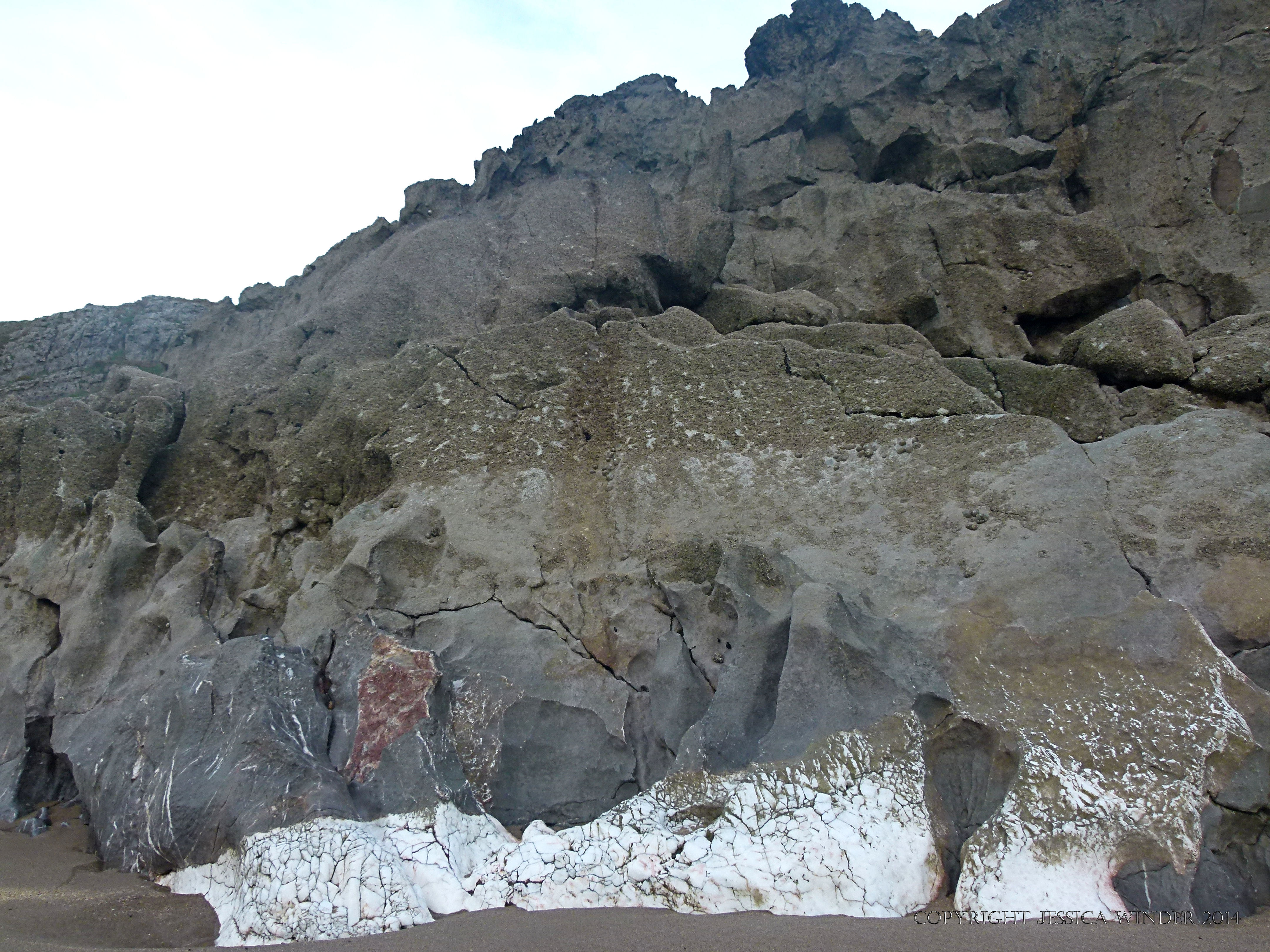 May Walk to Mewslade Bay 49 – Band of white calcite at base of Mewslade cliffs along a fault line. Gower Peninsula in South Wales.