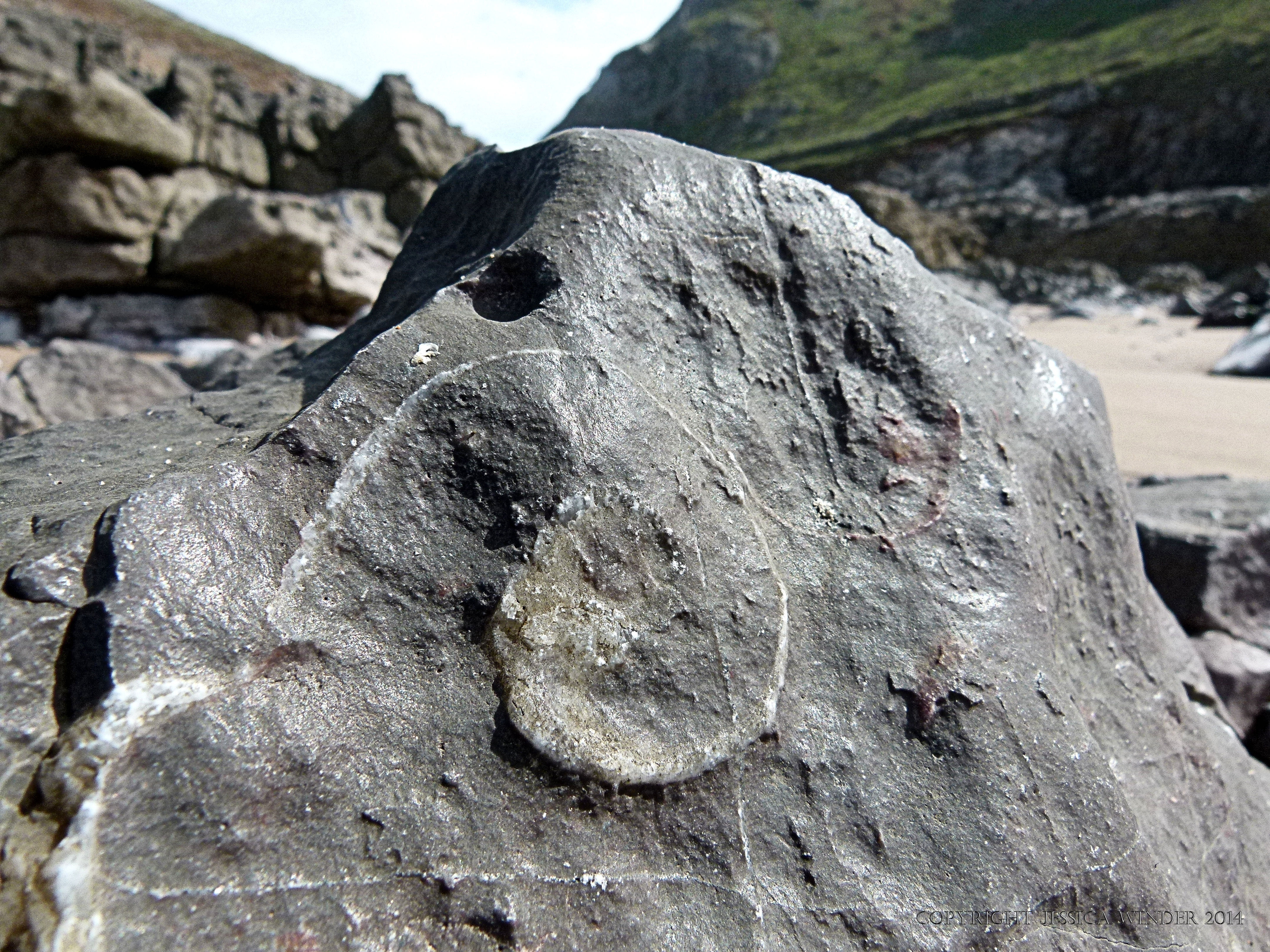 May Walk to Mewslade Bay 54 – Marine gastropod mollusc fossil in limestone on the beach at Mewslade Bay on the Gower peninsula in South Wales