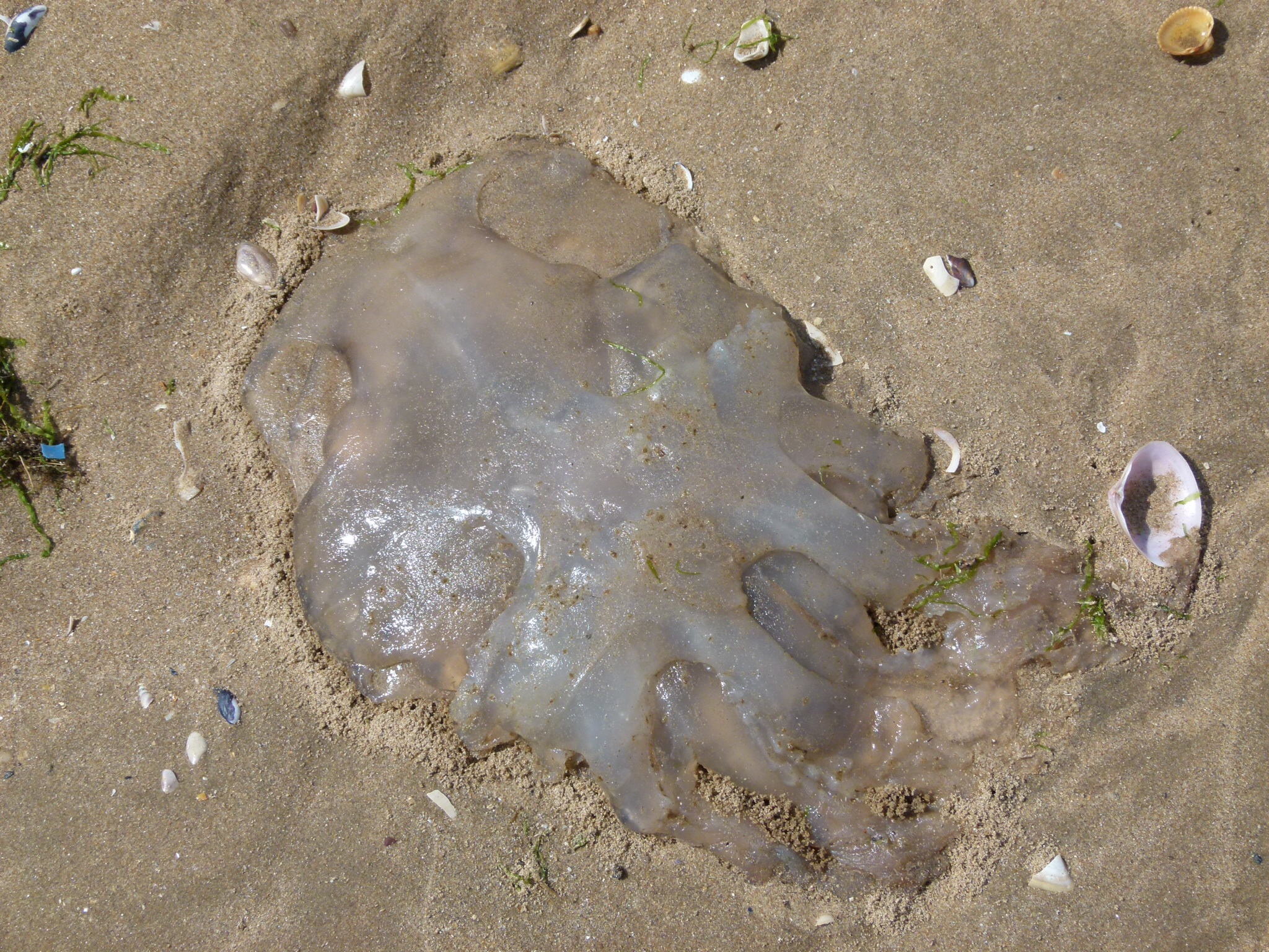 Rhossili Jellyfish 6 – Rhizostoma octopus (Linnaeus), the Barrel Jellyfish, stranded on the beach at Rhossili on the Gower Peninsula in South Wales on Sunday 27th July 2014.