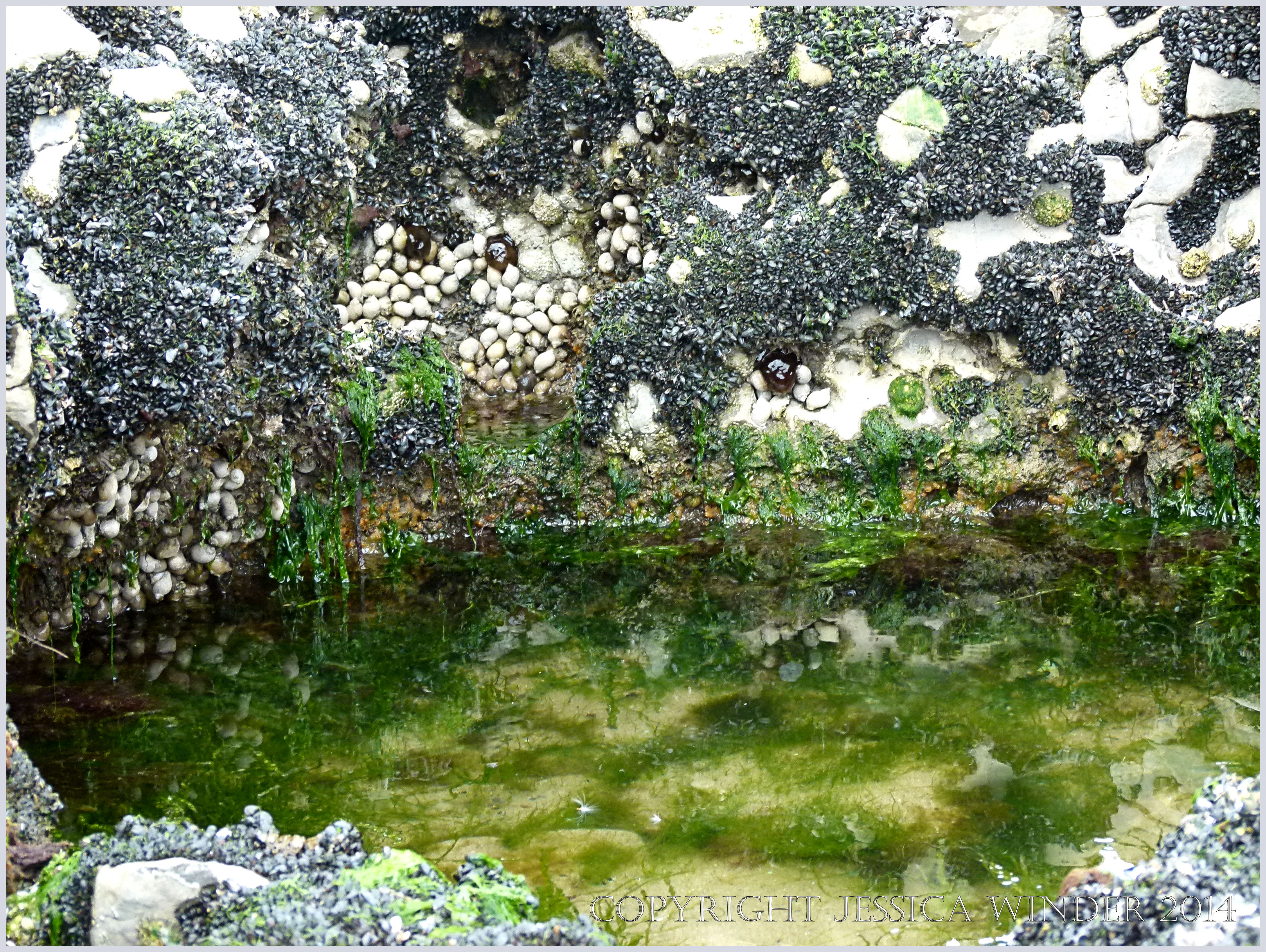 Rocks & Pools at Burry Holms 35 – Small algae-filled pool surrounded by a patchwork of small seashore creatures like mussels, barnacles, and dog whelks encrusting the rock