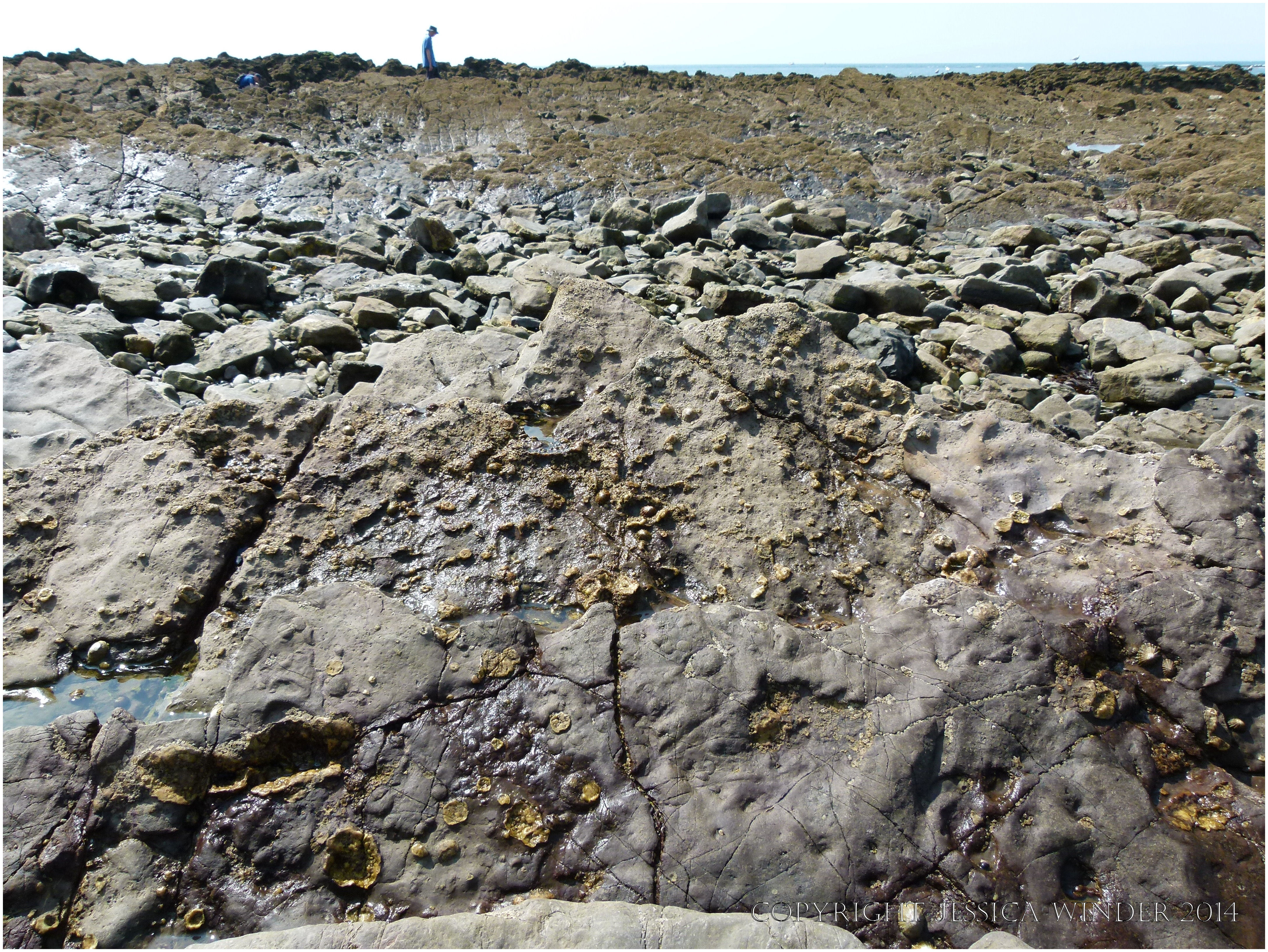 005 Out on the Causeway – Close to the Rhossili headland, the upstanding rock layers of the Worms Head Causeway spread out like the edges of pages in a book, pointing upwards and leaning towards the open sea. Each layer or stratum of rock has its own characteristics even though in this landward location it is all technically Black Rock Limestone Subgroup.