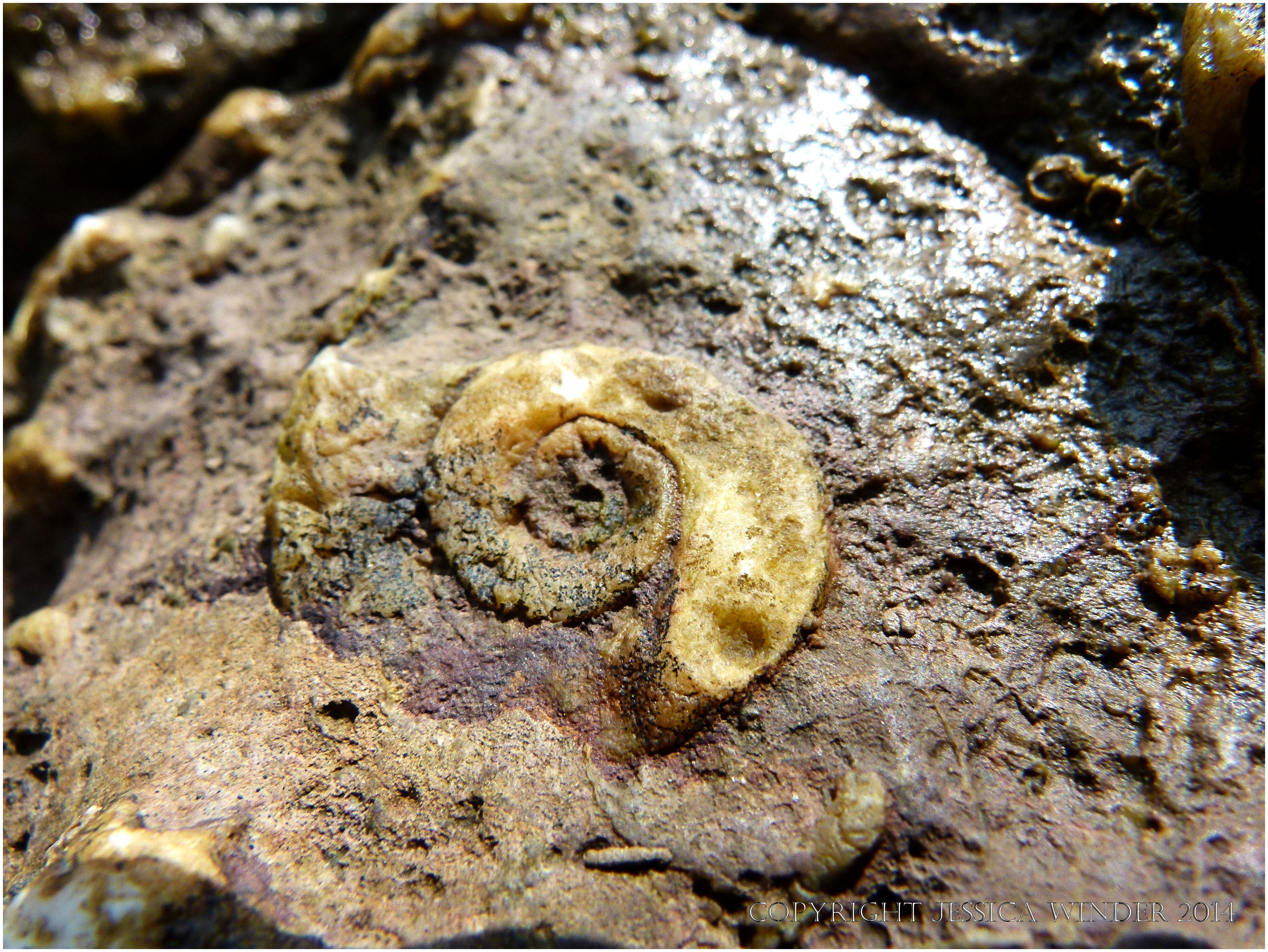 008 Out on the Causeway – A fossil, maybe a gastropod or even possibly a goniatite (?), made of crystalline calcite on rocks of the Worms Head Causeway in Gower, South Wales.