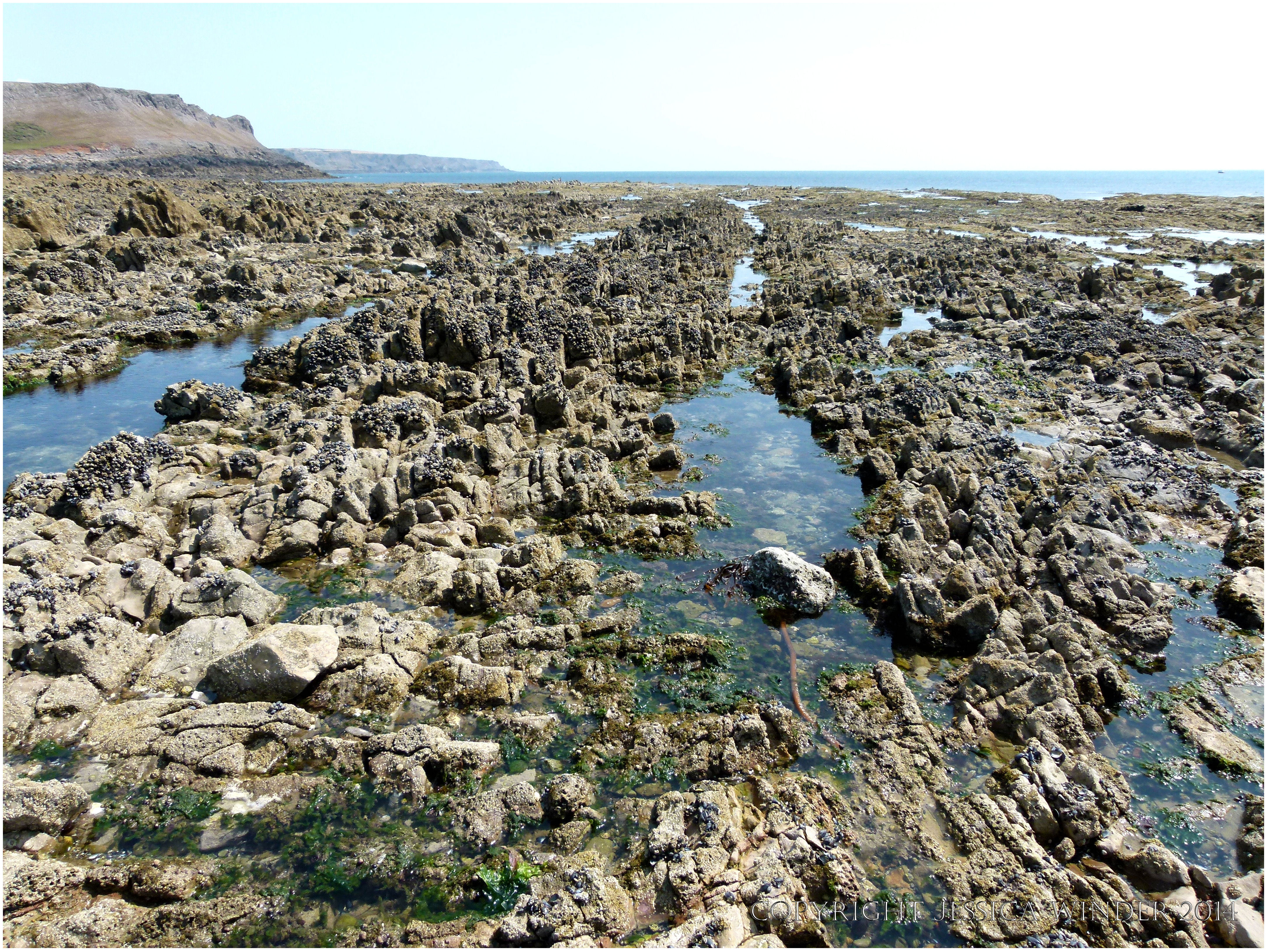 030 Out on the Causeway – View looking roughly southeast from the centre of Worms Head Causeway showing layers of rock alternating with pools of water aligned north-west to south-east on Worms Head Causeway