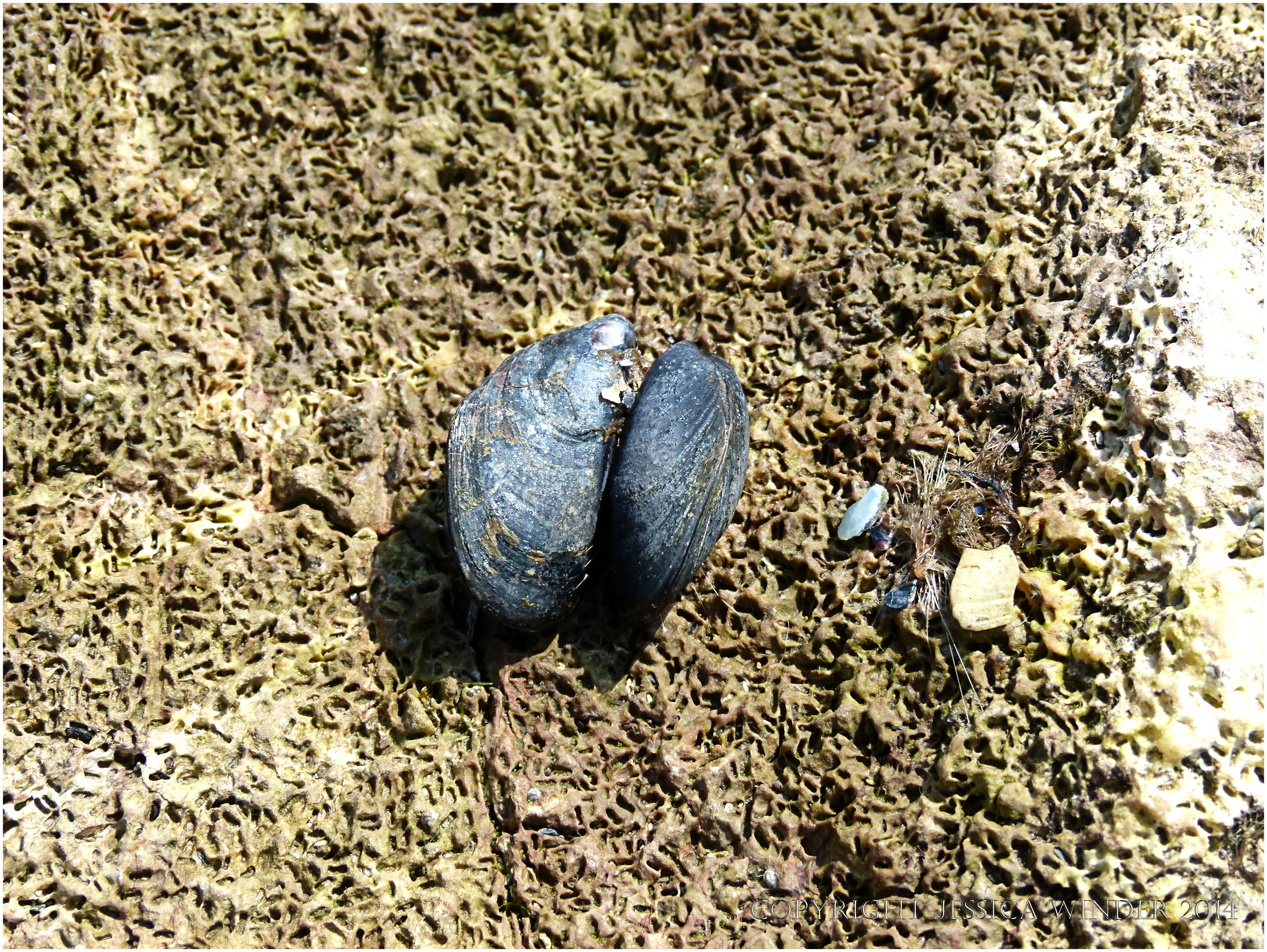 039 Out on the Causeway – Mussels (Mytilus edulis) attached to worm-eroded rock out on the Worms head Causeway in Gower, South Wales.