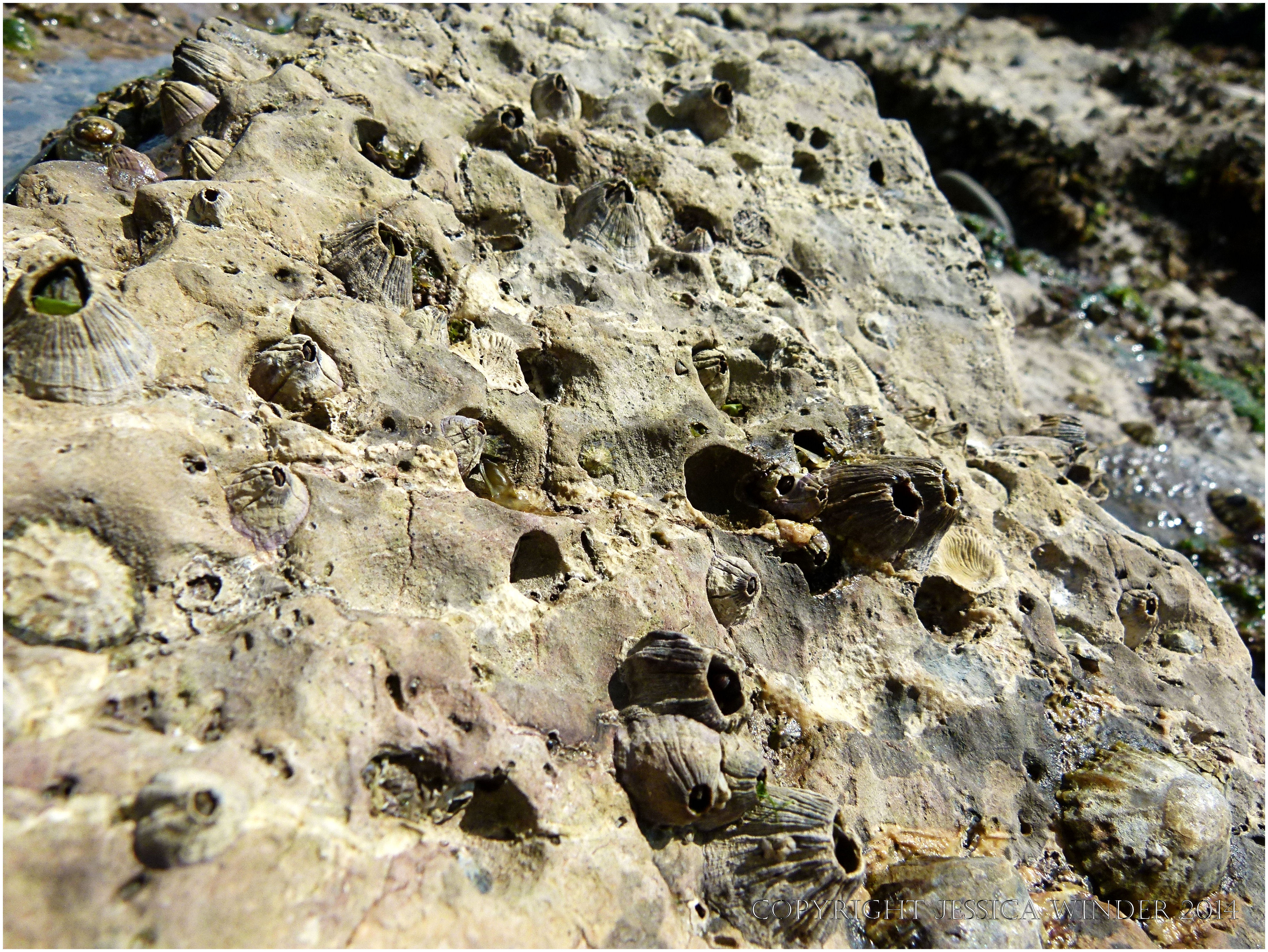 060 Out on the Causeway – Complex of micro-habitats in seashore limestone with holes in the rocks created by marine polychaetes and molluscs. Some burrows may still have the original occupants; while others are secondarily used by unrelated seashore creatures, which in turn extend and deepen the burrows and hollows by their own activities. Further bio-erosion is also taking place on a microscopic level by epi- and endo-lithic bacteria, algae, fungi, and lichens. Added to this is chemical erosion causing the limestone to dissolve. Photographed on the Worms Head Causeway in Gower, South Wales.