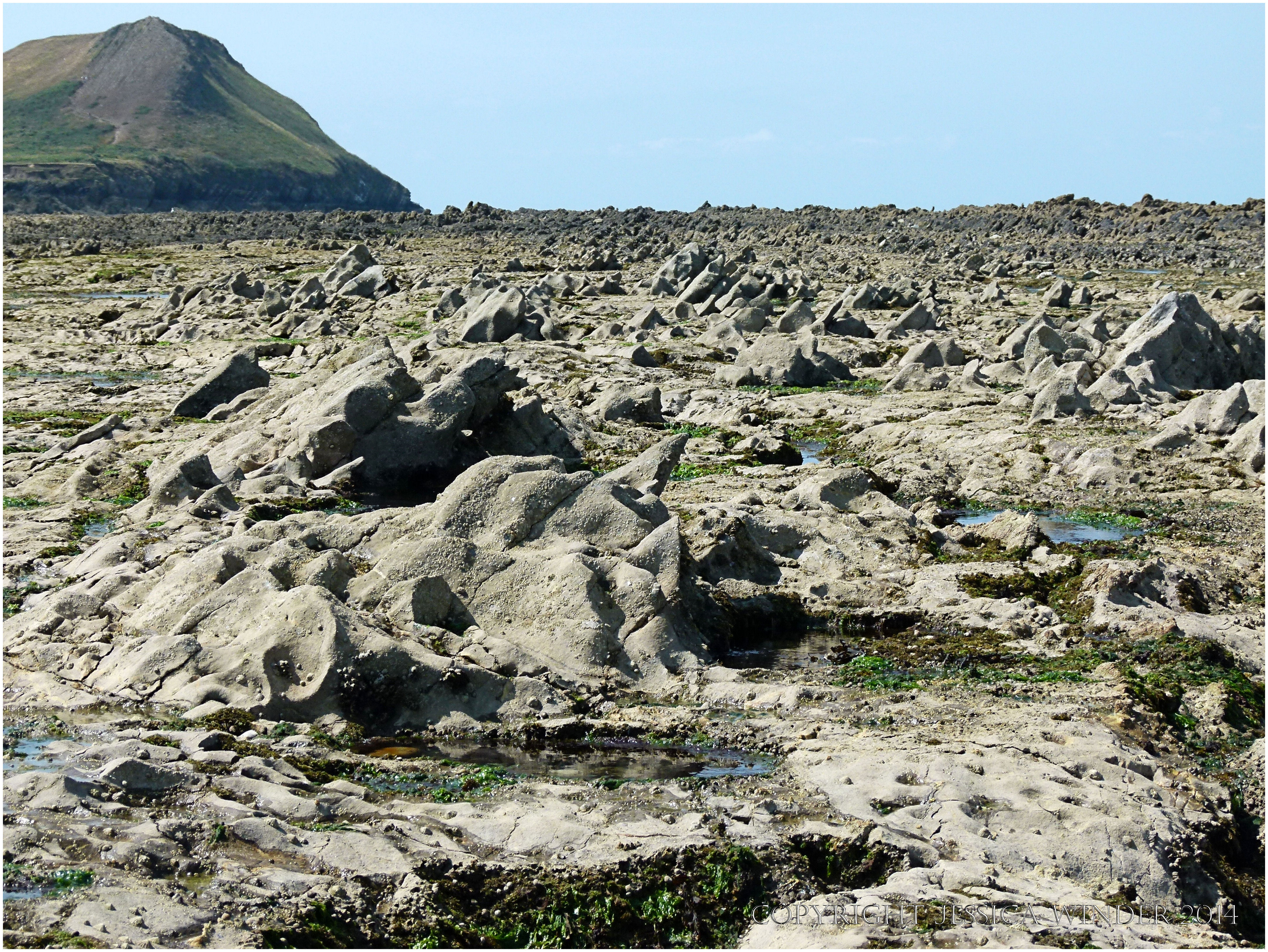 066 Out on the Causeway – Sharp, pointed rocks stick up at an angle, like giant shark’s teeth, on the surface of the Worms Head Causeway on the Gower Peninsula in South Wales.
