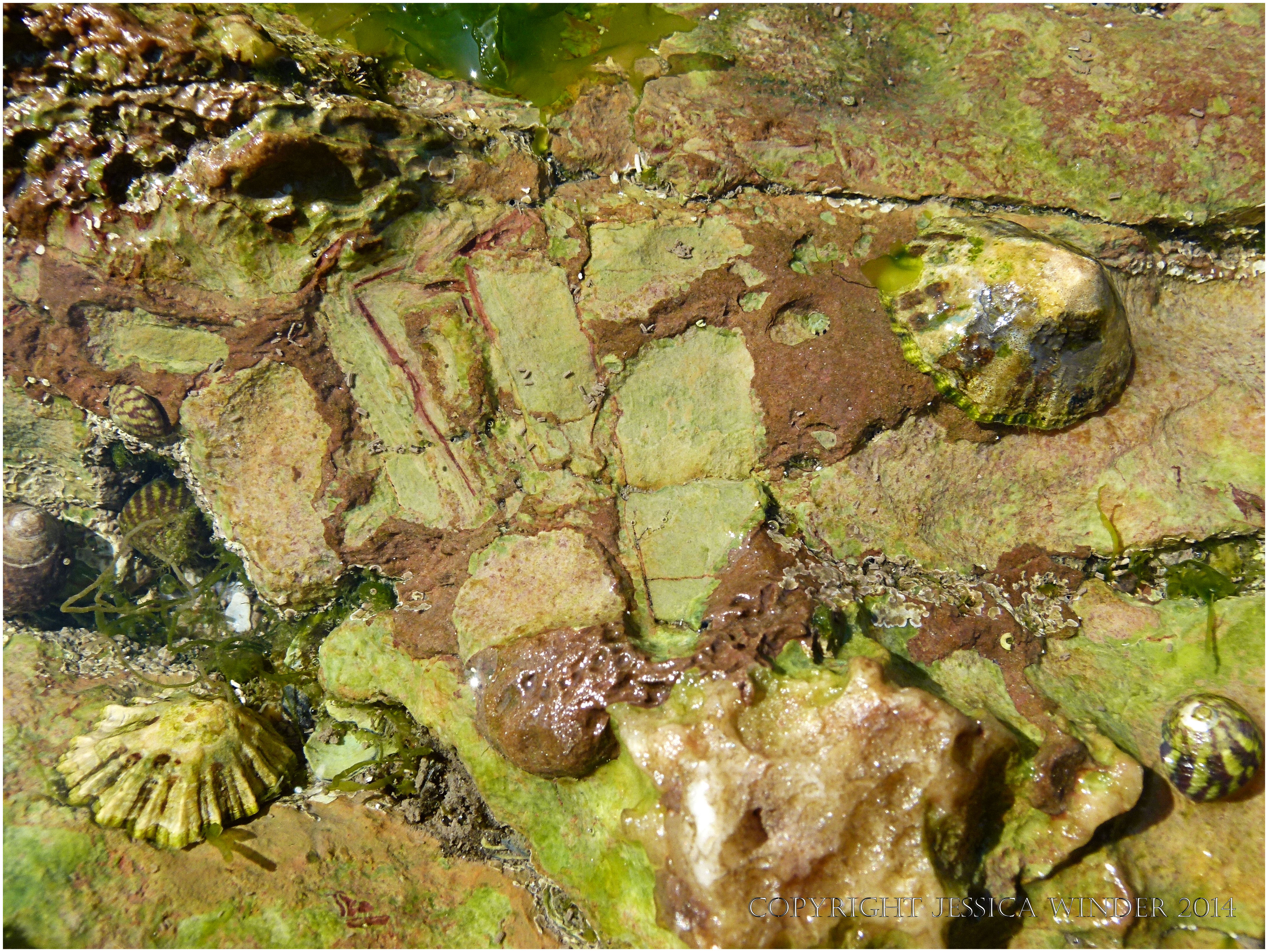 078 Out on the Causeway – Green algal film covering calcite and haematite under a shallow trickle of water on the Worms Head Causeway in Gower, South Wales. The algae are a food source for the marine molluscs that occupy this habitat.
