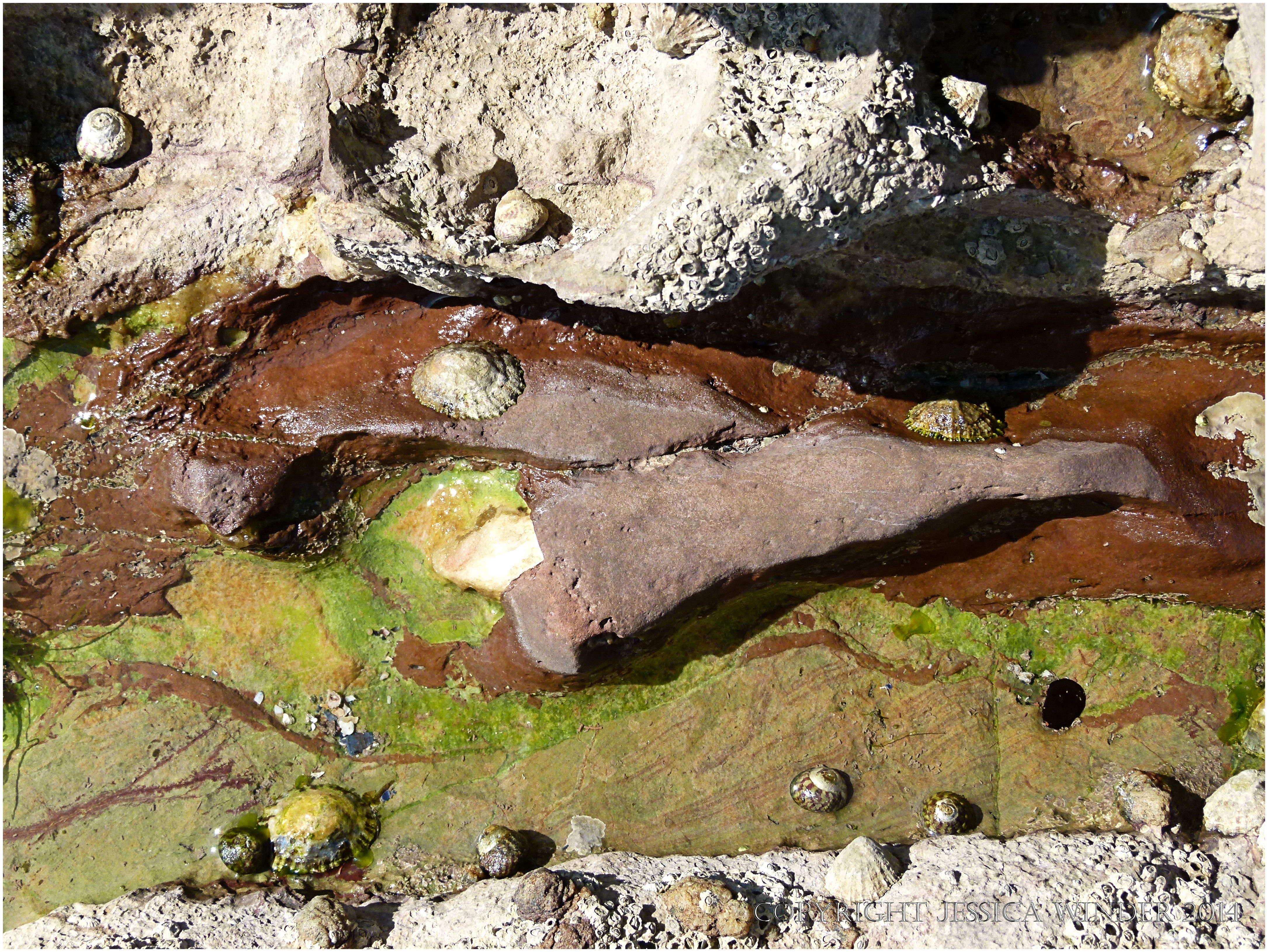 079 Out on the Causeway – Green algal film covering calcite and haematite under a shallow trickle of water on the Worms Head Causeway in Gower, South Wales. The algae are a food source for the marine molluscs that occupy this habitat.