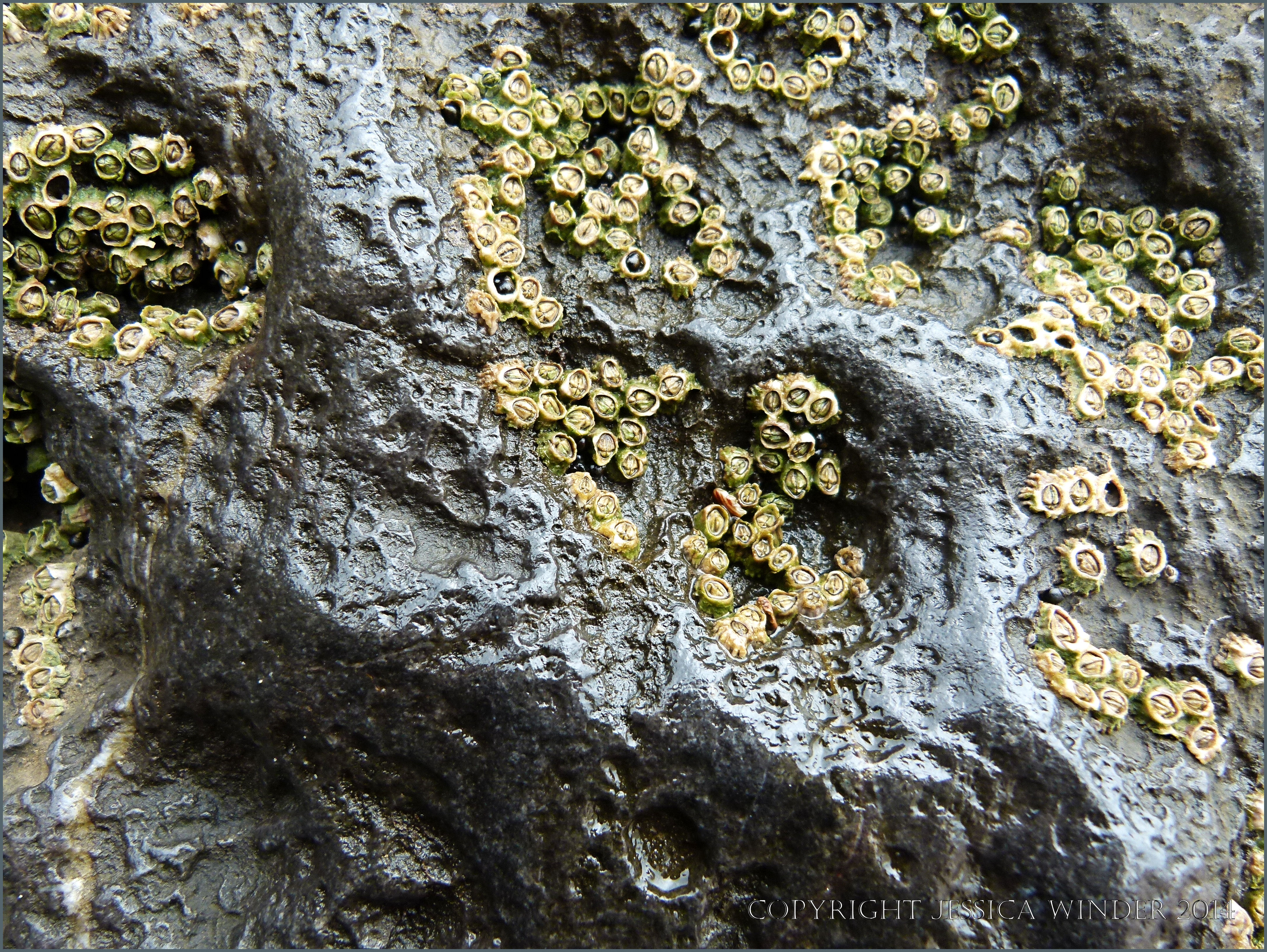 Tenby Rock Textures 19 – Carboniferous Limestone with small erosion pits (on a millimetre scale) on top of larger erosion pits (on a centimetre scale) with acorn barnacles attached, on cliffs at South Beach in Tenby, South Wales.